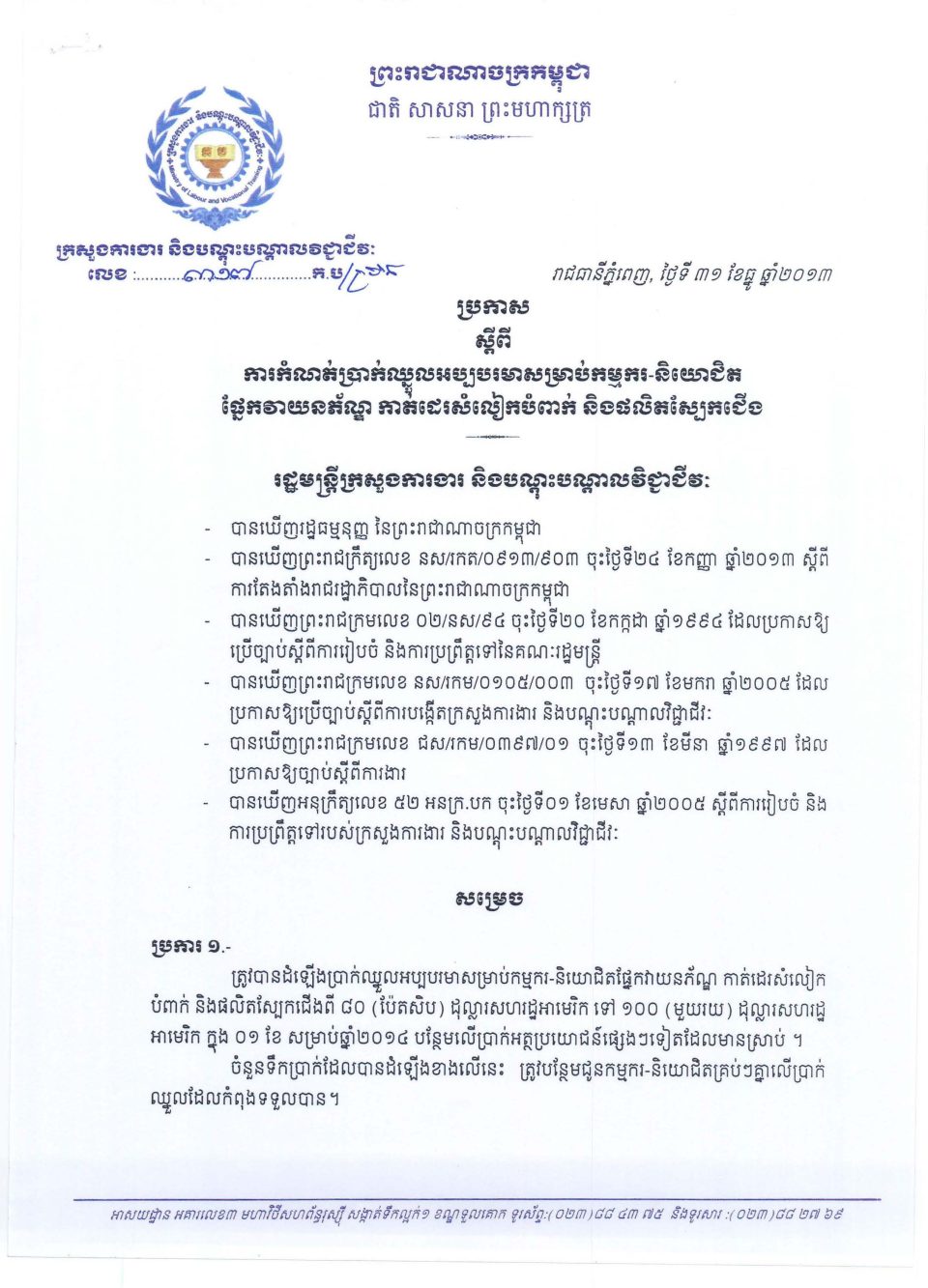 ប្រកាសប្រកាសស្ដីពីការកំណត់ប្រាក់ឈ្នួលអប្បបរមាសម្រាប់កម្មករនិយោជិតវិស័យវាយនភណ្ឌកាត់ដេរសំលៀកបំពាក់និងផលិតស្បែកជើងសម្រាប់ឆ្នាំ២០១៤ ថ្ងៃចន្ទ, 23 ខែតុលា, 20230399 ប្រកាសស្ដីពីការកំណត់ប្រាក់ឈ្នួលអប្បបរមាសម្រាប់កម្មករនិយោជិតសម្រាប់ឆ្នាំ២០១៤