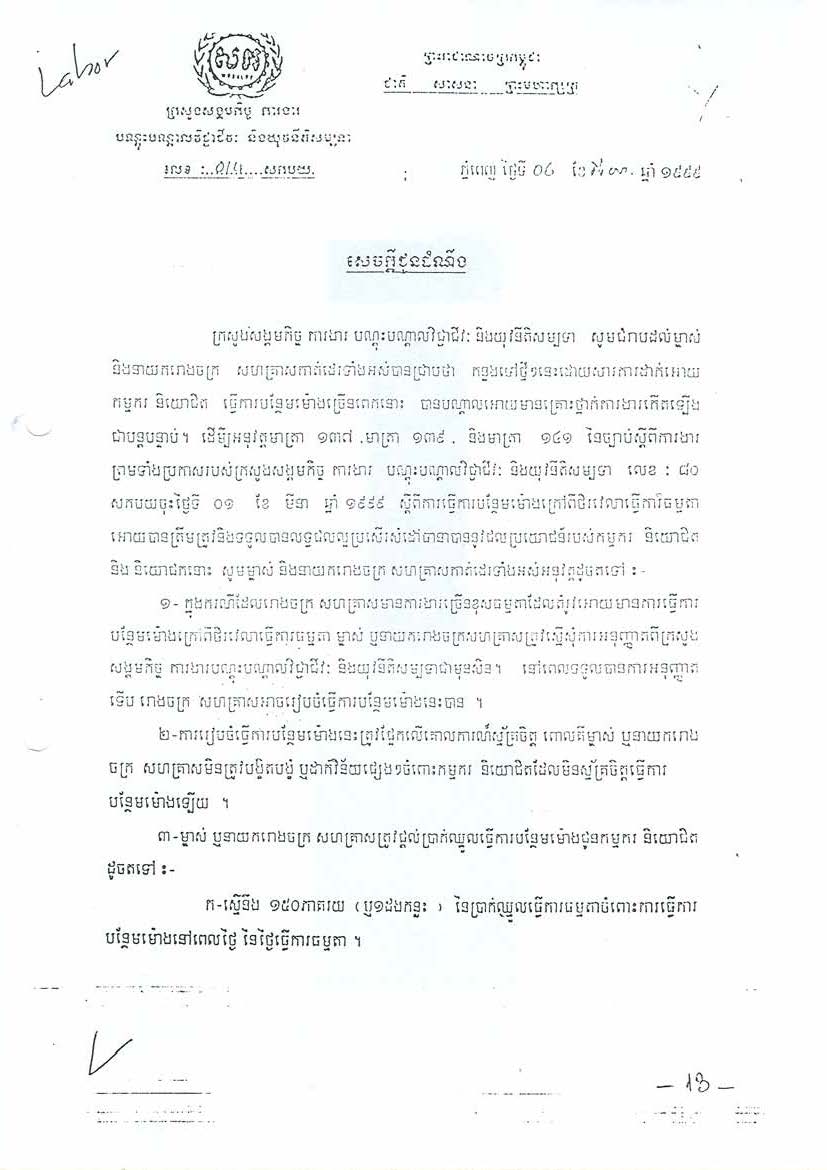 សេចក្តីជូនដំណឹងសេចក្ដីជូនដំណឹងស្ដីពីការធ្វើការបន្ថែមម៉ោងក្រៅពីថិរវេលាធ្វើការធម្មតា ថ្ងៃអង្គារ, 24 ខែតុលា, 20230546 សេចក្ដីជូនដំណឹងលេខ_014_បន្ថែមម៉ោងលើម៉ោងធម្មតាសម្រាប់និយោជិត – KH