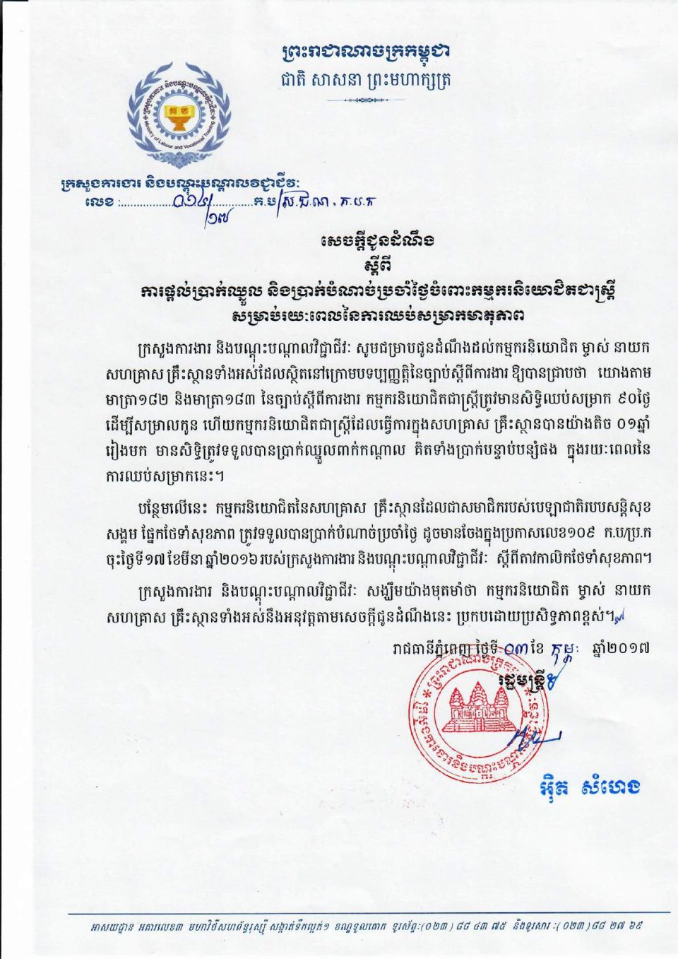 សេចក្តីជូនដំណឹងសេចក្ដីជូនដំណឹង ស្ដីពីការផ្ដល់ប្រាក់ឈ្នួល និងប្រាក់បំណាច់ប្រចាំថ្ងៃចំពោះកម្មករនិយោជិតស្រ្ដី សម្រាប់រយៈពេលនៃការឈប់សម្រាកមាតុភាព ថ្ងៃសុក្រ, 3 ខែកុម្ភៈ, 2017ថ្ងៃពុធ, 24 ខែមករា, 20240423 L810_សេចក្តីជូនដំណឹង_ផ្តល់ប្រាក់មាតុភាព