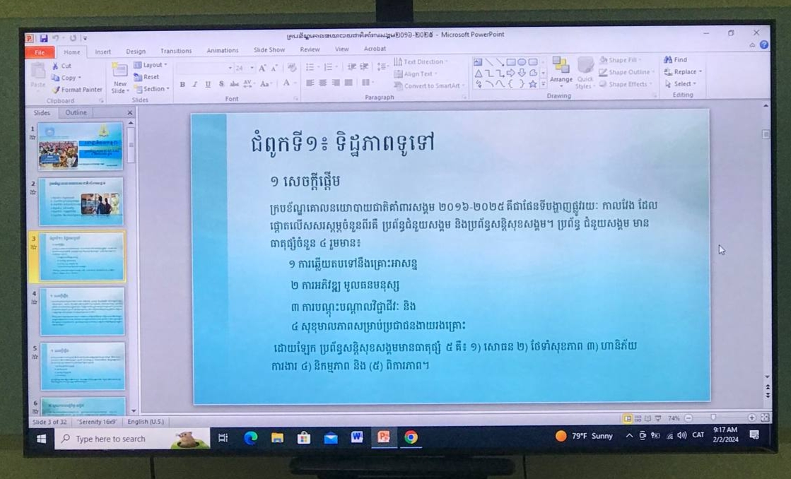 នៅថ្ងៃទី២ ខែកុម្ភៈ ឆ្នាំ២០២៤ ផ្នែកផែនការ និងសហប្រតិបត្តិការ បានរៀបចំវគ្គបណ្តុះបណ្តាល ស្តីពី ក្របខ័ណ្ឌគោលនយោបាយជាតិគាំពារសង្គម ២០១៦-២០២៥ ក្នុងកម្រិតផ្នែកដែលបង្ហាញដោយ លោក ទុយ ភារុន មន្រ្តីផ្នែកផែនការ និងសហប្រតិបត្តិការ នៅបន្ទប់ប្រជុំ អ.ក.ជ.ប.អ. ដែលមានសមាសភាពមកពីផ្នែកសិក្សាស្រាវជ្រាវ ផ្នែកគាំទ្រទូទៅ និងហិរញ្ញវត្ថុ និងផ្នែកផែនការ និងសហប្រតិបត្តិការ។