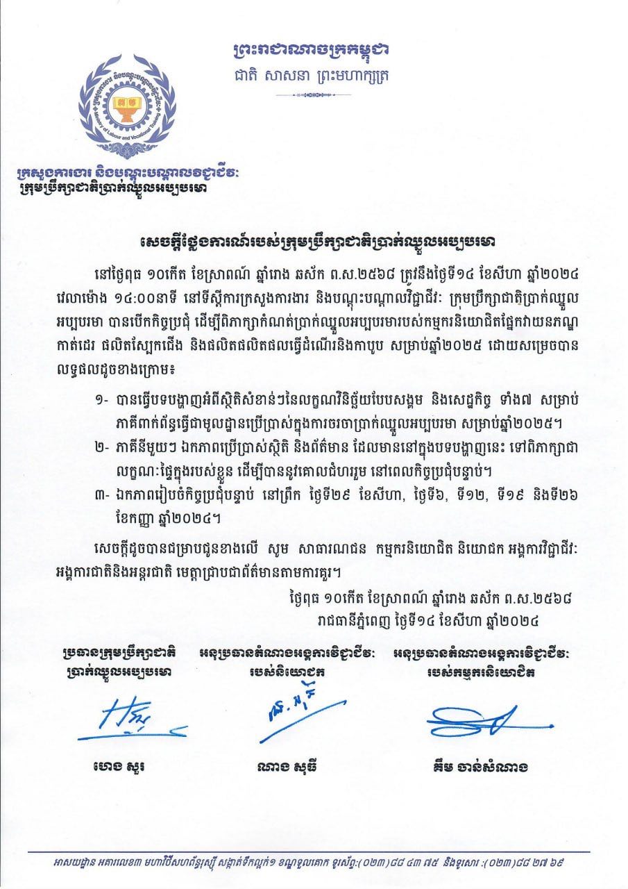 សេចក្តីថ្លែងការណ៍ពីលទ្ធផលពិភាក្សាប្រាក់ឈ្នួលអប្បបរមាជូនកម្មករនិយោជិតសម្រាប់ឆ្នាំ២០២៥ លើកទី១