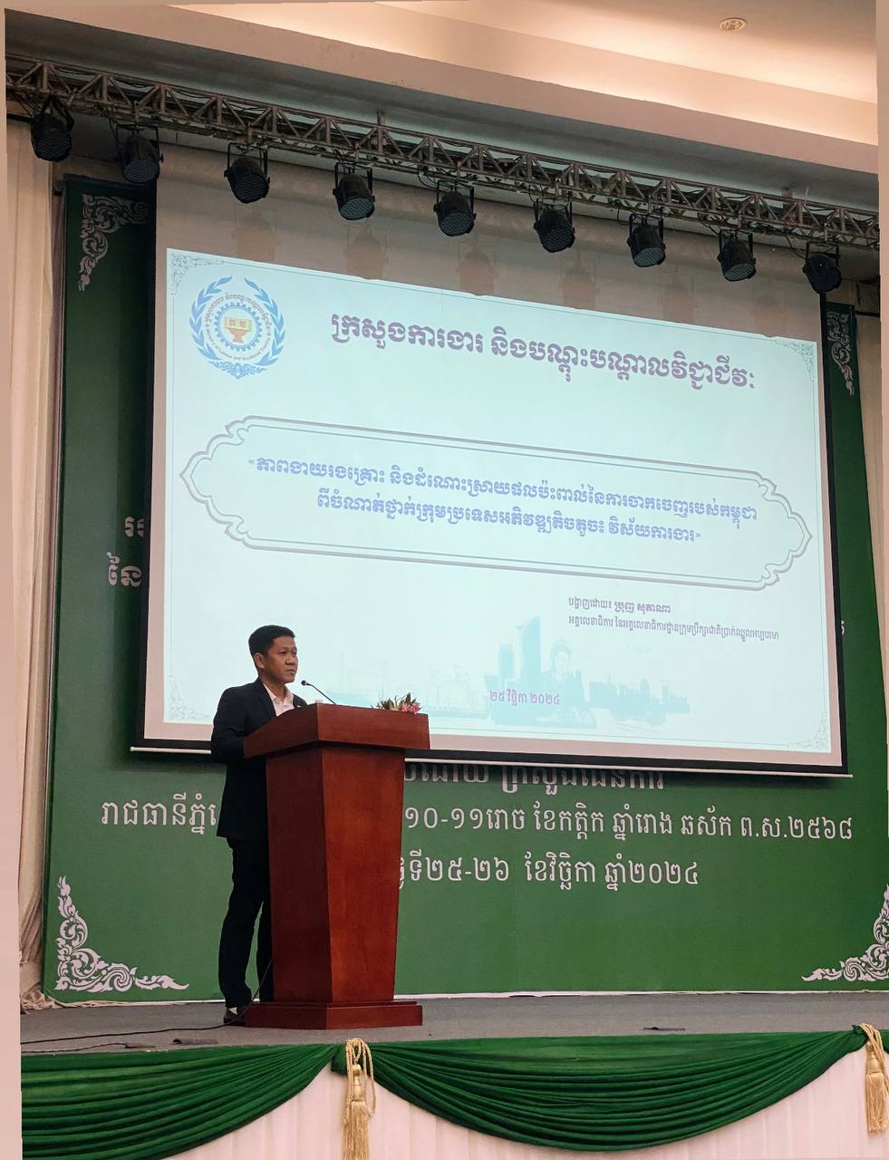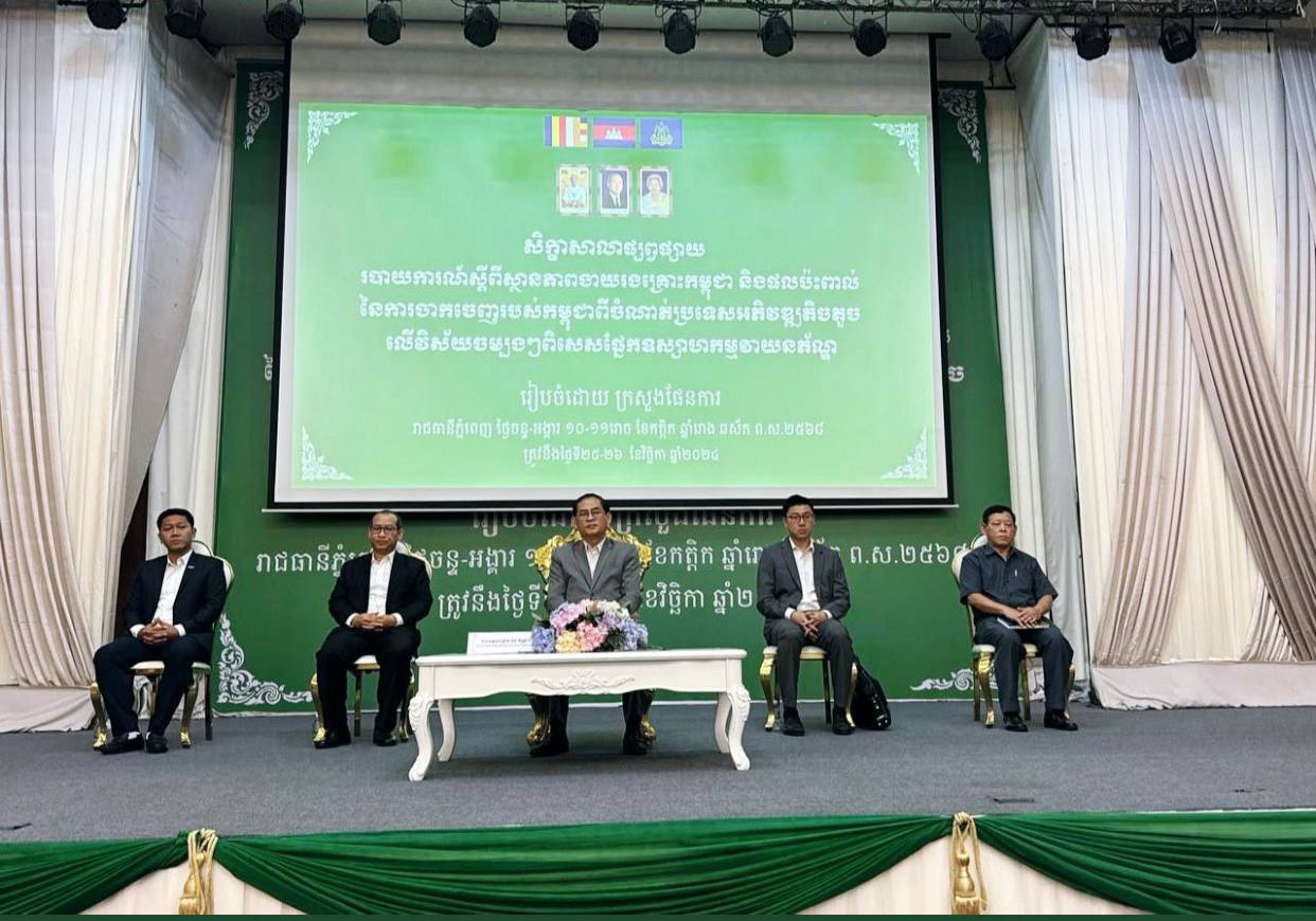កាលពីថ្ងៃទី២៥ ខែវិច្ឆិកា ឆ្នាំ២០២៤ ឯកឧត្តម ប្រុញ សុភាណា អគ្គលេខាធិការ នៃអគ្គលេខាធិការដ្ឋានក្រុមប្រឹក្សាជាតិប្រាក់ឈ្នួលអប្បបរមា បានដឹកនាំក្រុមការងារ និងចូលរួមវាគ្មិនកិត្តិយសនៃសិក្ខាសាលាផ្សព្វផ្សាយរបាយការណ៍ស្តីពី «ស្ថានភាព នៃការងាយរងគ្រោះកម្ពុជា និងផលប៉ះពាល់នៃការចាកចេញលើវិស័យ ចម្បងៗ ពិសេសផ្នែកឧស្សាហកម្មវាយនភណ្ឌ» រៀបចំដោយក្រសួងផែនការក្រោមអធិបតីភាព ឯកឧត្តមបណ្ឌិត ប៉ូច ប៊ុណ្ណាក់ រដ្ឋលេខាធិការ និងជាអនុប្រធានអចិន្ត្រៃយ៍នៃ គណៈកម្មាធិការជាតិសម្រាប់ការចាកចេញរបស់កម្ពុជាពីចំណាត់ក្រុមប្រទេសអភិវឌ្ឍតិចតួច(គ.ច.ក.អ.ត.) ដែលមានសមាសភាពចូលរួមពី សមាជិកក្រុមការងារ បច្ចេកទេស នៃគ.ច.ក.អ.ត., តំណាងមន្ទីររាជ-ធានីពាក់ព័ន្ធ, តំណាងវិស័យឯកជន, អង្គការក្រៅរដ្ឋាភិបាល និងតំណាងសកលវិទ្យាល័យ ប្រមាណជា៩០រូប។