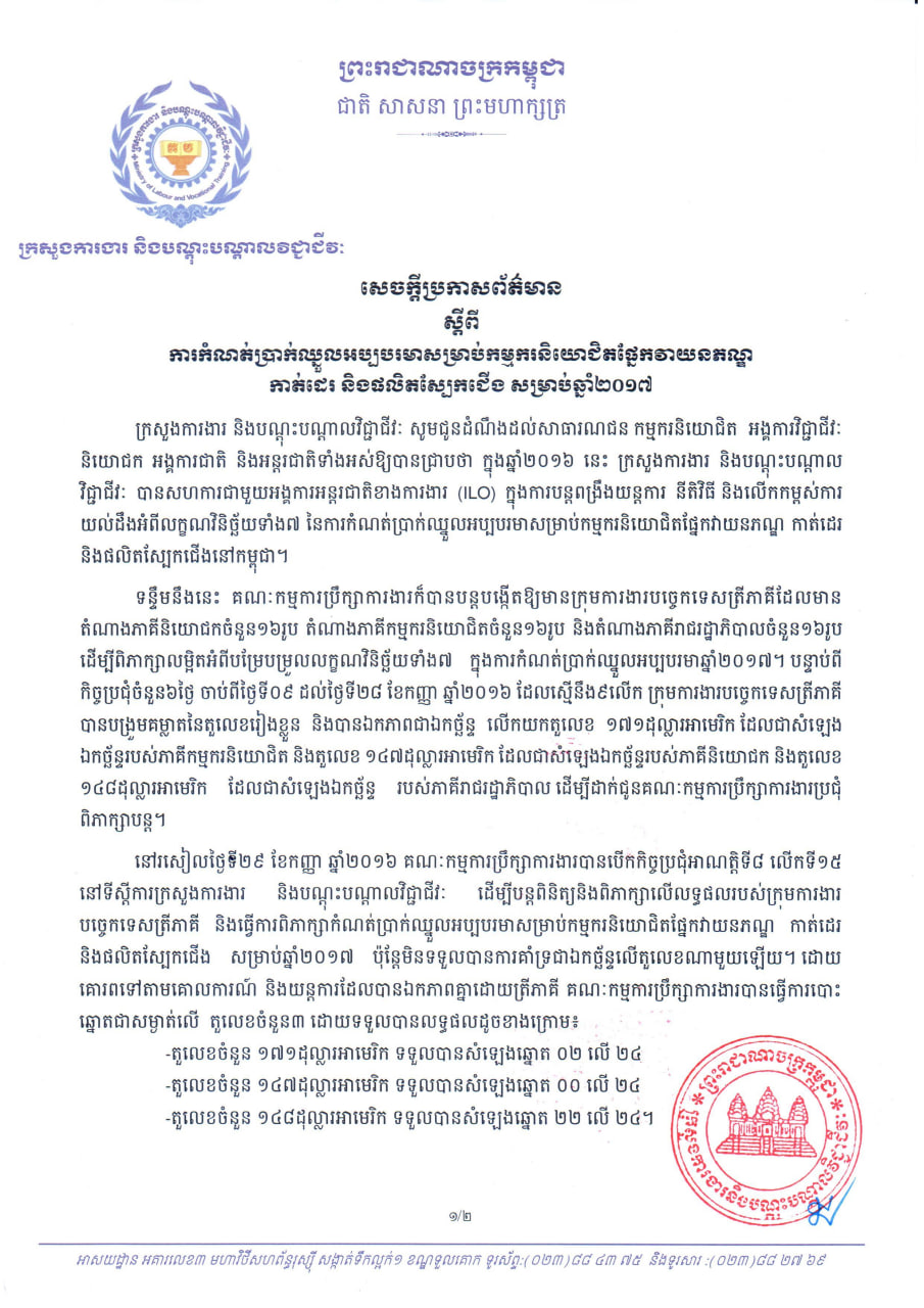 សេចក្តីប្រកាសព័ត៌មាន ចុះថ្ងៃទី២៩ ខែកញ្ញា ឆ្នាំ២០១៦ ស្តីពីកំណត់ប្រាក់ឈ្នួលអប្បបរមាសម្រាប់កម្មករនិយោជិតផ្នែកវាយនភណ្ឌ កាត់ដេរ និងផលិតស្បែកជើង ឆ្នាំ២០១៧