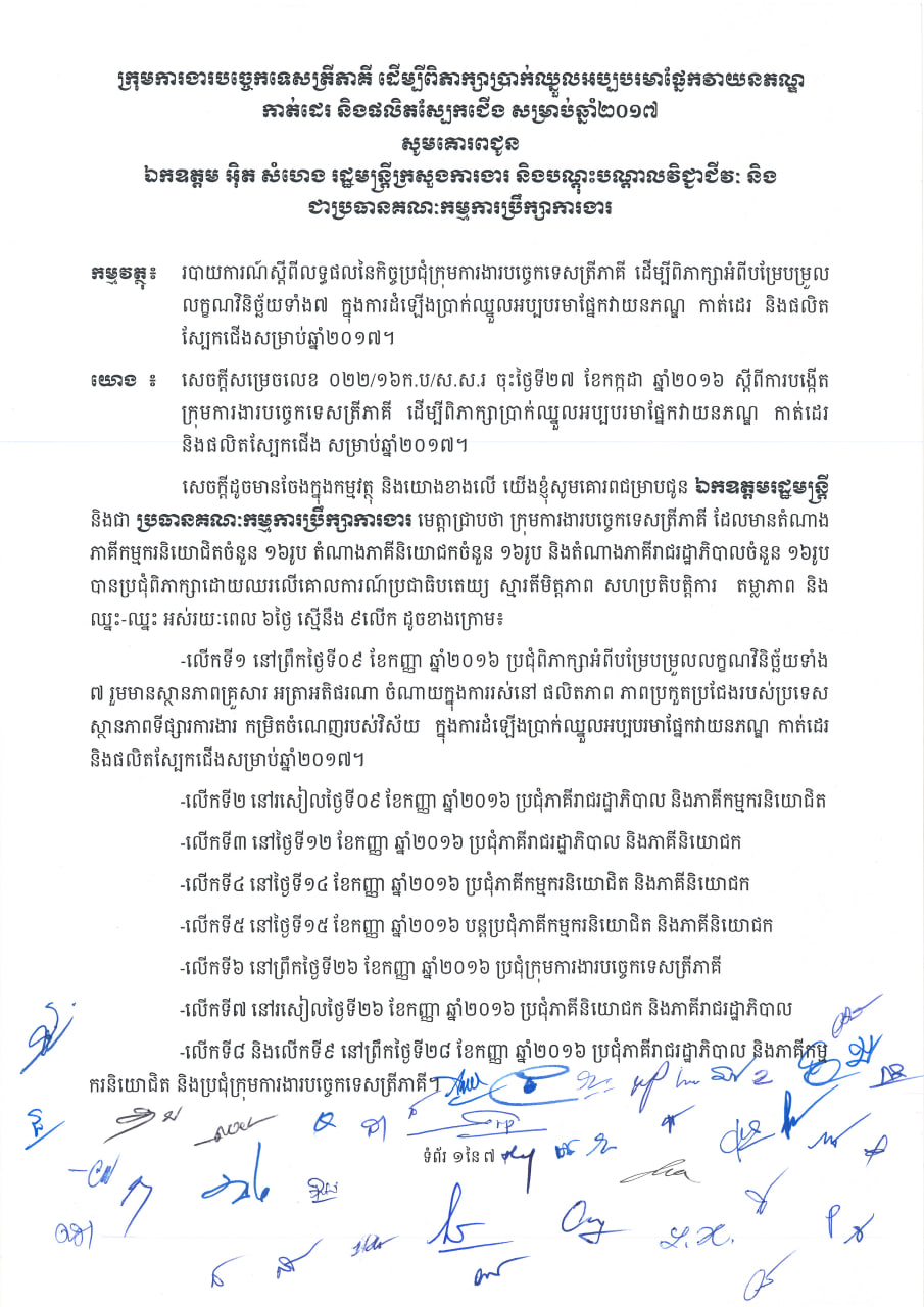 សេចក្តីជូនដំណឹងរបាយការណ៍របស់ក្រុមការងារបច្ចេកទេសត្រីភាគី ដើម្បីពិភាក្សាប្រាក់ឈ្នួលអប្បបរមាសម្រាប់កម្មករនិយោជិតផ្នែកវាយនភណ្ឌ កាត់ដេរ និងផលិតស្បែកជើង សម្រាប់ឆ្នាំ២០១៧ ចុះថ្ងៃទី២៨ ខែកញ្ញា ឆ្នាំ២០១៦ ថ្ងៃចន្ទ, 23 ខែមករា, 2017ថ្ងៃព្រហស្បតិ៍, 23 ខែមករា, 20250141 របាយការណ៍របស់ក្រុមការងារបច្ចេកទេសត្រីភាគី ដើម្បីពិភាក្សាប្រាក់ឈ្នួលអប្បបរមាសម្រាប់កម្មករនិយោជិតផ្នែកវាយនភណ្ឌ កាត់ដេរ និងផលិតស្បែកជើង សម្រាប់ឆ្នាំ២០១៧ ចុះថ្ងៃទី២៨ ខែកញ្ញា ឆ្នាំ២០១៦