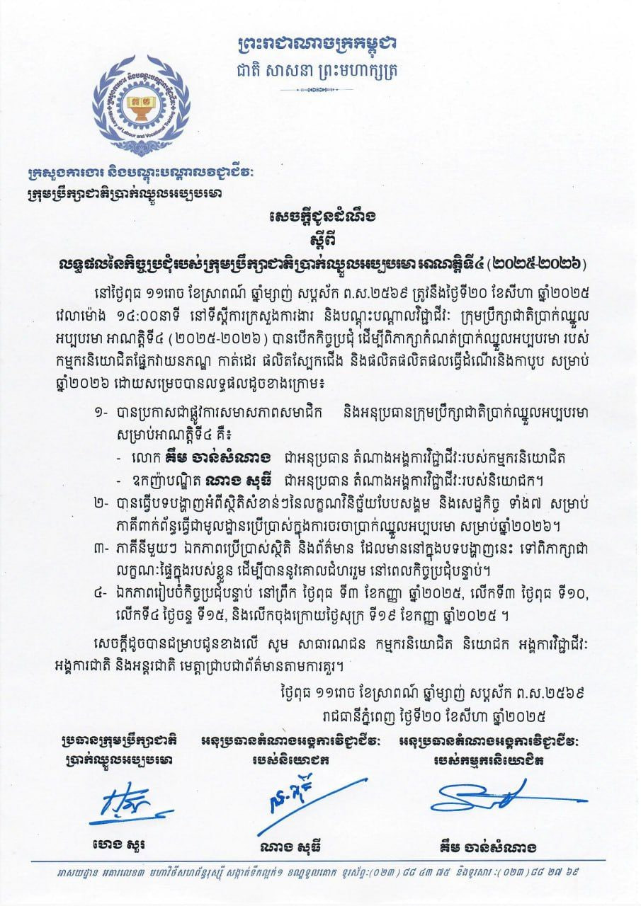 សេចក្តីជូនដំណឹងសេចក្ដីជូនដំណឹង ស្ដីពីលទ្ធផលនៃកិច្ចប្រជុំរបស់ក្រុមប្រឹក្សាជាតិប្រាក់ឈ្នួលអប្បបរមា អាណត្តិទី៤(២០២៥-២០២៦) ថ្ងៃពុធ, 27 ខែសីហា, 2025ថ្ងៃពុធ, 27 ខែសីហា, 2025054 សេចក្តីជូនដំណឹង_ប្រជុំលើកទី១