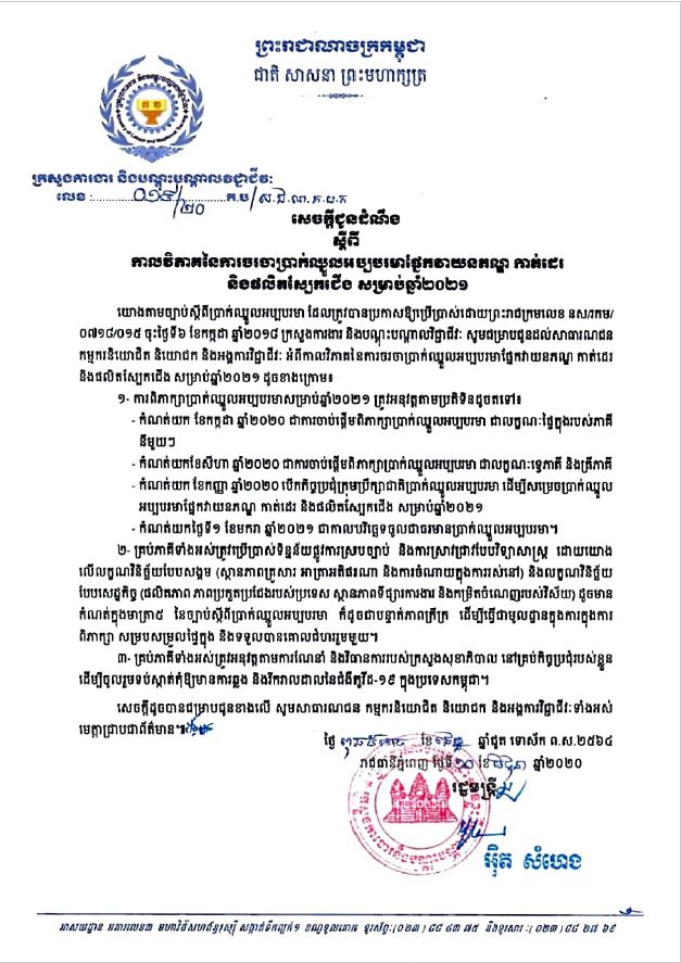 សេចក្តីជូនដំណឹង ស្ដីពីកាលវិភាគនៃការចរចាប្រាក់ឈ្នួលអប្បបរមាផ្នែកវាយនភណ្ឌ កាត់ដេរ និងផលិតស្បែកជើង សម្រាប់ឆ្នាំ២០២១