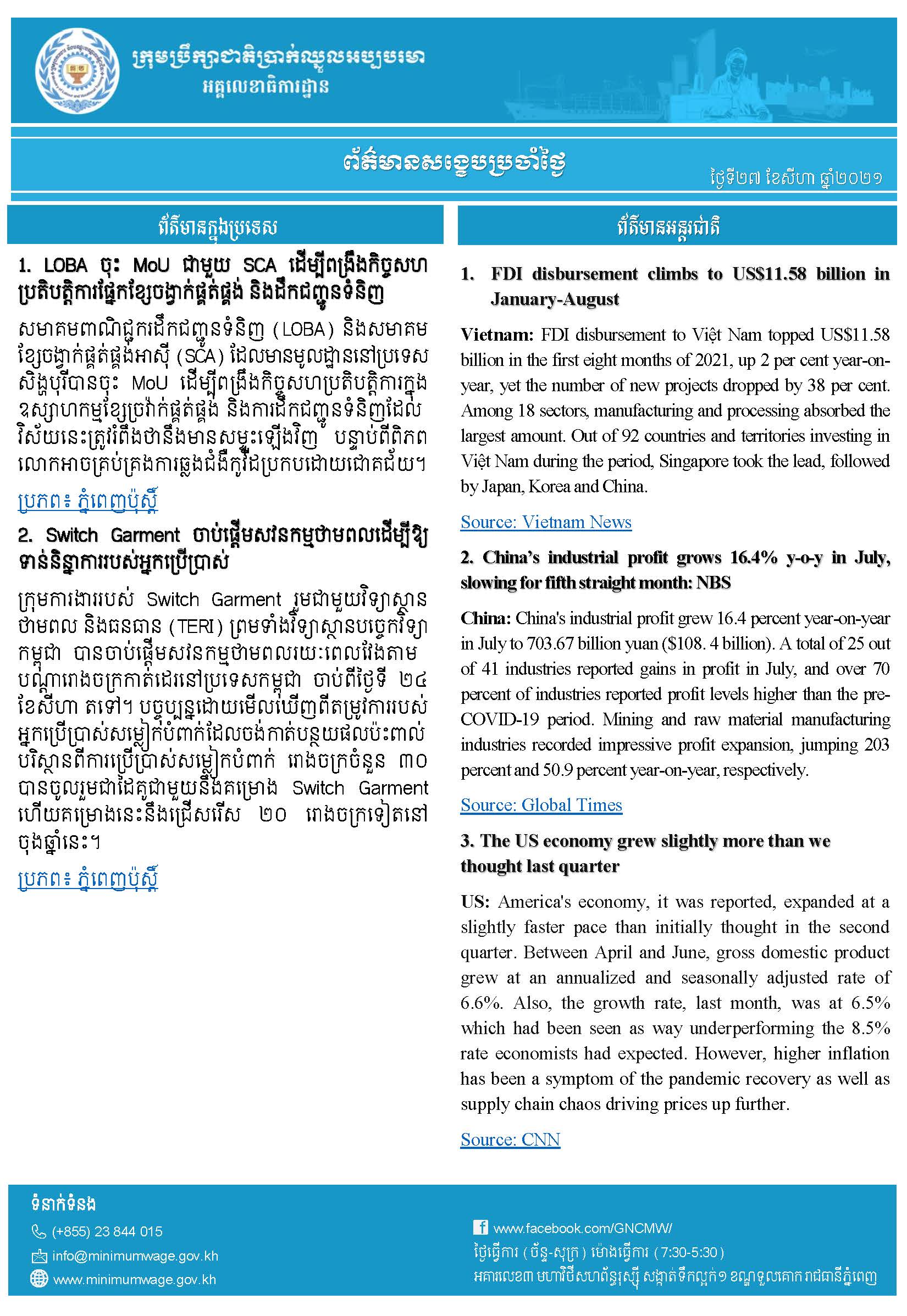 ១. FDI disbursement climbs to US$11.58 billion in January-August