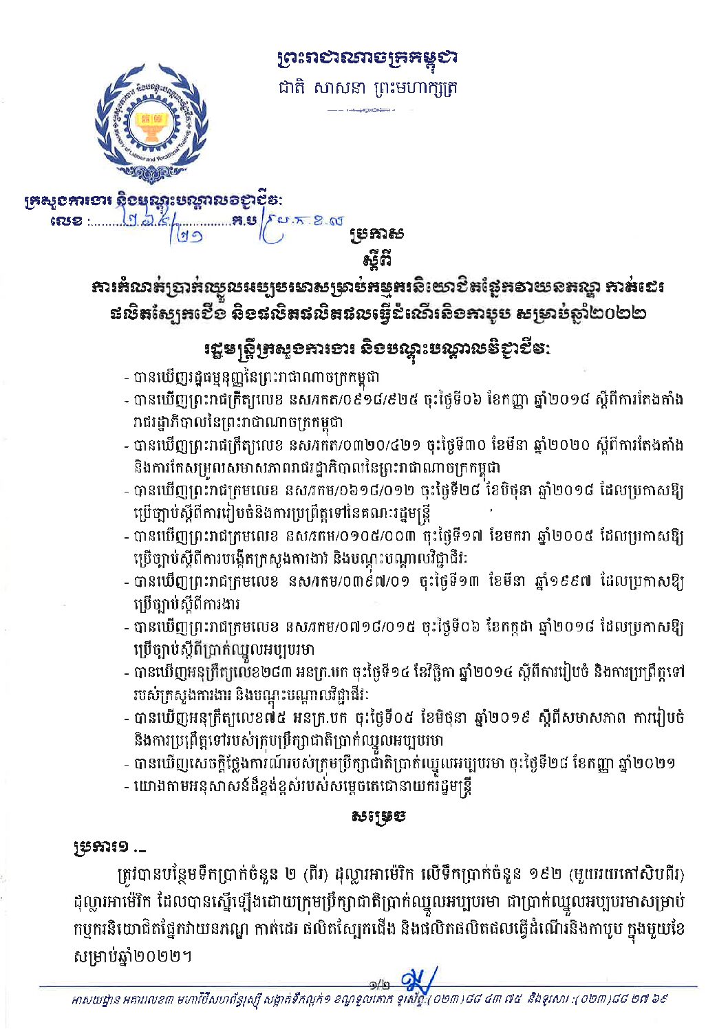 ប្រកាសប្រកាសស្តីពីការកំណត់ប្រាក់ឈ្នួលអប្បបរមាសម្រាប់ឆ្នាំ២០២២ ថ្ងៃពុធ, 29 ខែកញ្ញា, 202102653 ប្រកាសកំណត់ប្រាក់ឈ្នួលអប្បរមាសម្រាប់ឆ្នាំ២០២២