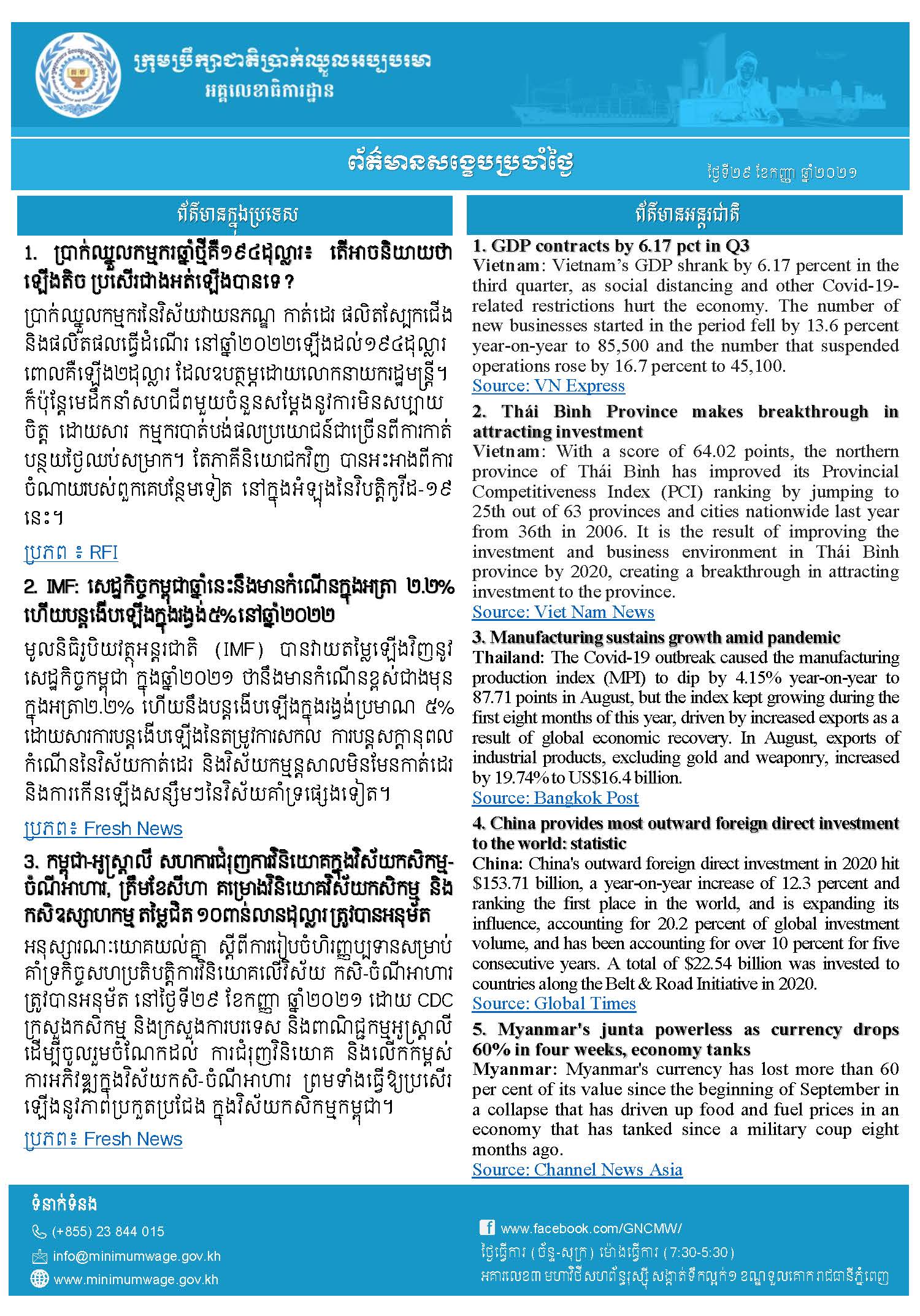ព័ត៌មានសង្ខេបជាតិ និងអន្តរជាតិប្រចាំថ្ងៃទី២៩ ខែកញ្ញា ឆ្នាំ២០២១