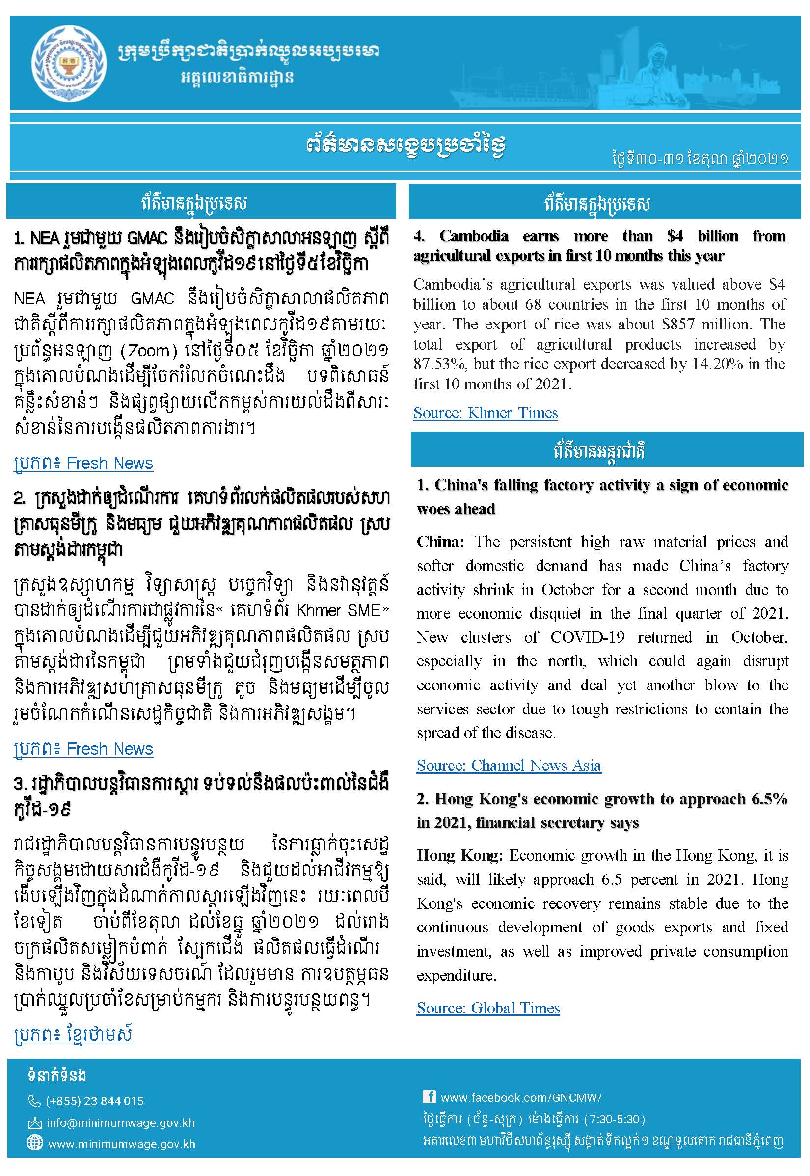 ១. NEA រួមជាមួយ GMAC នឹងរៀបចំសិក្ខាសាលាអនឡាញ ស្តីពីការរក្សាផលិតភាពក្នុងអំឡុងពេលកូវីដ១៩ នៅថ្ងៃទី៥ ខែវិច្ឆិកា