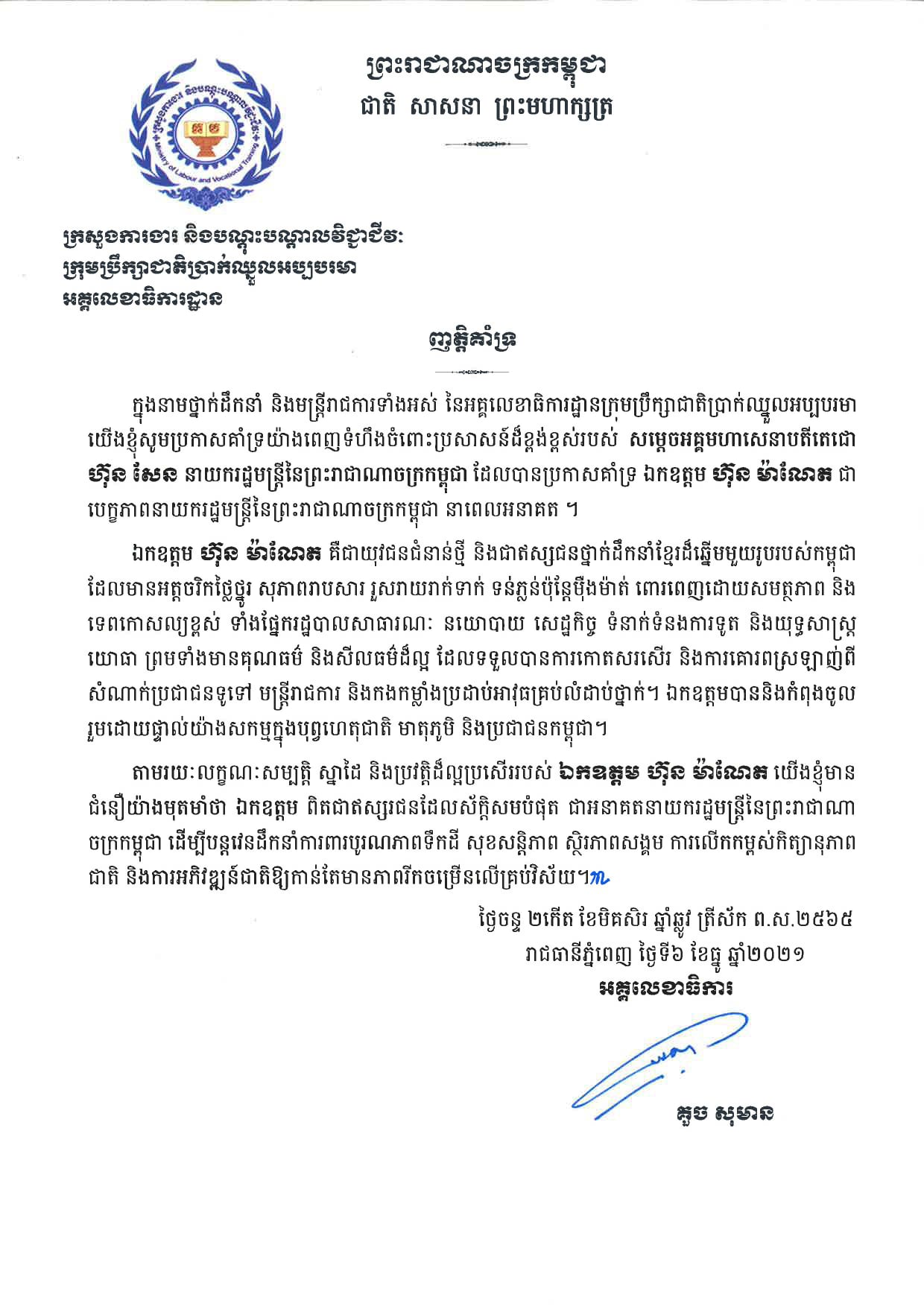ក្នុងនាមថ្នាក់ដឹកនាំ និងមន្រ្តីរាជការទាំងអស់ នៃអគ្គលេខាធិការដ្ឋានក្រុមប្រឹក្សាជាតិប្រាក់ឈ្នួលអប្បបរមា យើងខ្ញុំសូមប្រកាសគាំទ្រយ៉ាងពេញទំហឹងចំពោះប្រសាសន៍ដ៏ខ្ពង់ខ្ពស់របស់ សម្តេចអគ្គមហាសេនាបតីតេជោ ហ៊ុន សែន នាយករដ្ឋមន្រ្តីនៃព្រះរាជាណាចក្រកម្ពុជា ដែលបានប្រកាសគាំទ្រ ឯកឧត្តម ហ៊ុន ម៉ាណែត ជាបេក្ខភាពនាយករដ្ឋមន្រ្តីនៃព្រះរាជាណាចក្រកម្ពុជា នាពេលអនាគត។