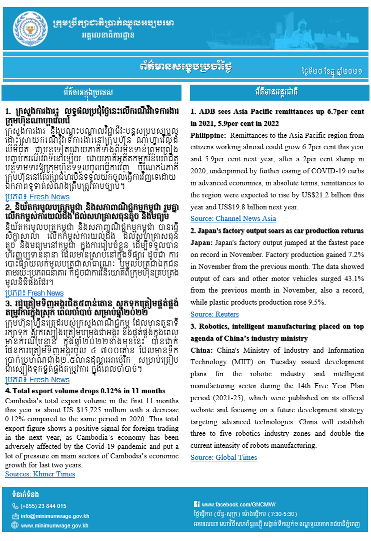 ១. ADB sees Asia Pacific remittances up 6.7per cent in 2021, 5.9per cent in 2022