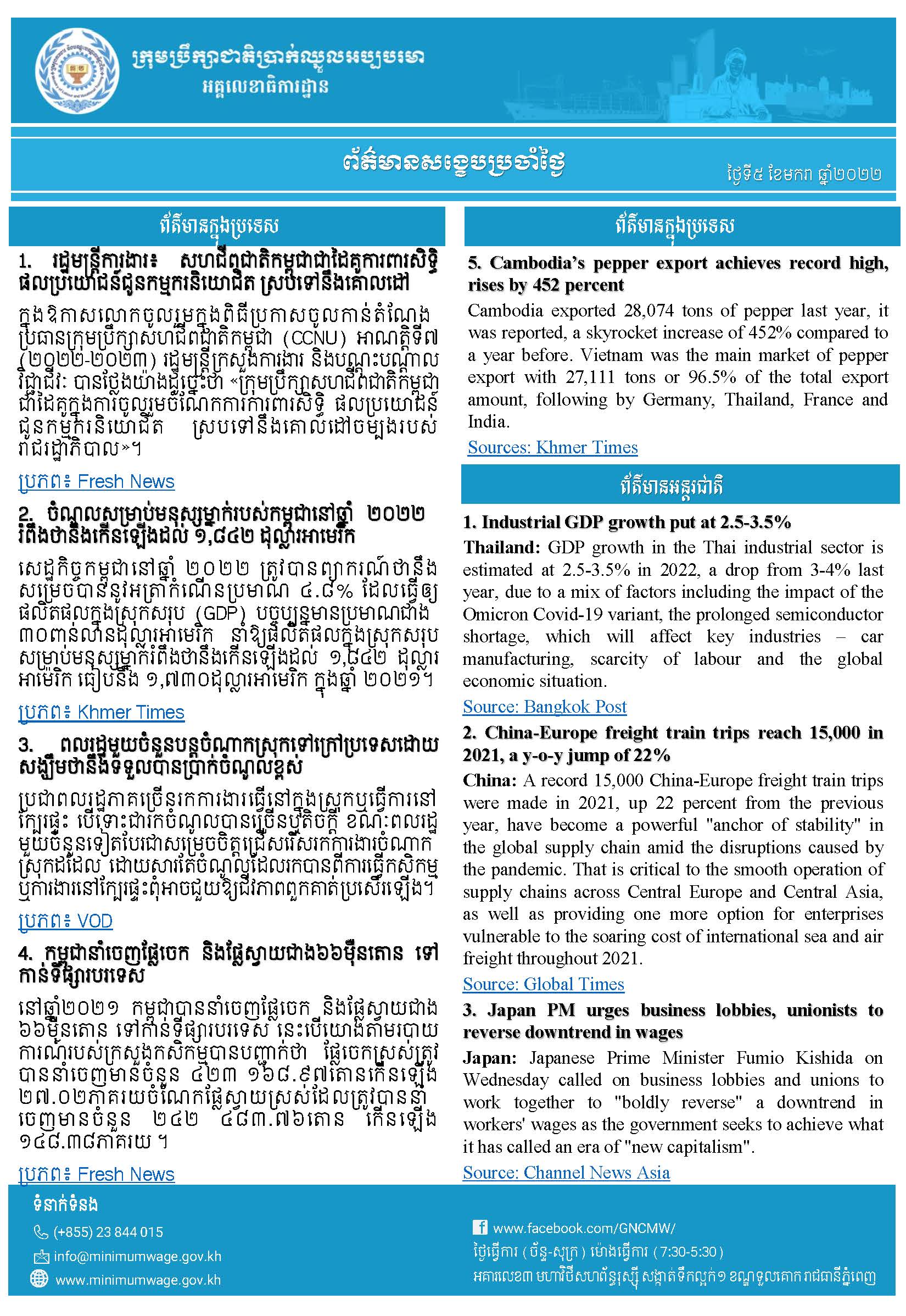 ២. ចំណូលសម្រាប់មនុស្សម្នាក់របស់កម្ពុជានៅឆ្នាំ ២០២២ រំពឹងថានឹងកើនឡើងដល់ ១,៨៤២ ដុល្លារអាមេរិក