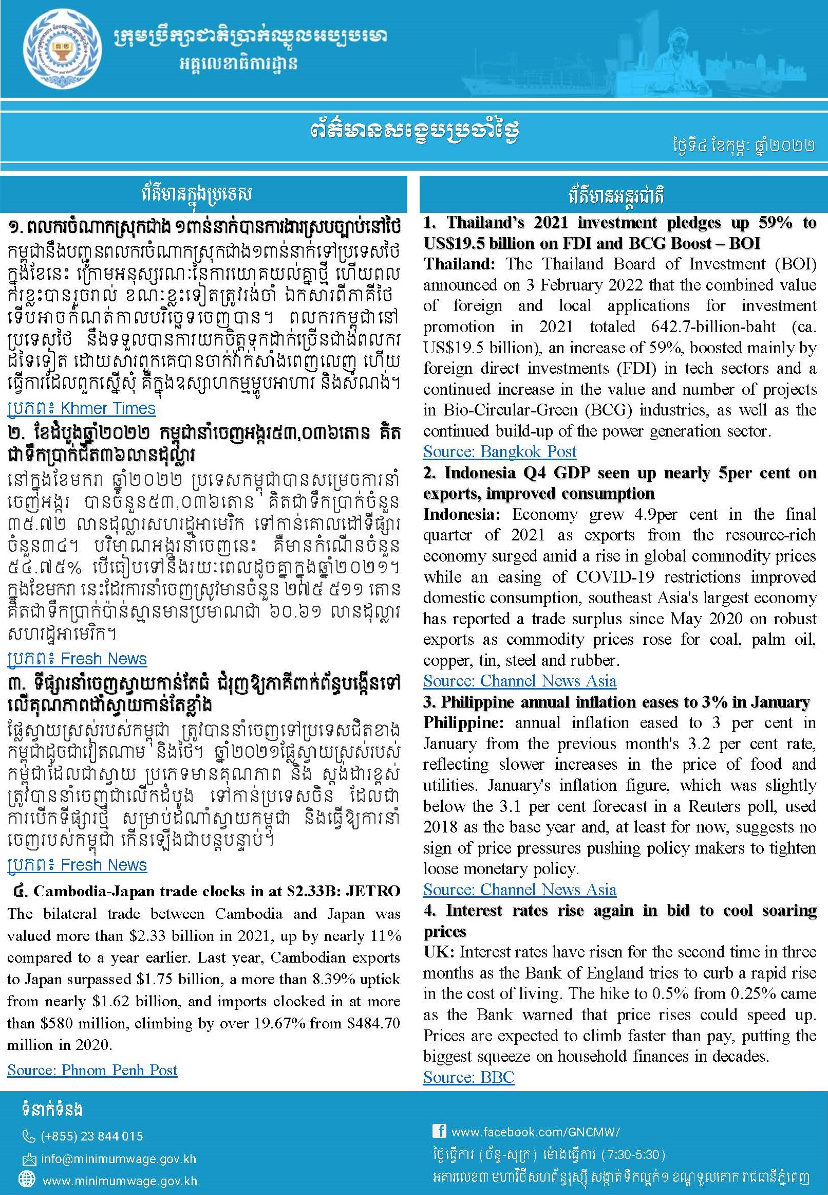 ព័ត៌មានសង្ខេបជាតិ និងអន្តរជាតិប្រចាំថ្ងៃទី៤ ខែកុម្ភៈ ឆ្នាំ២០២២ ពី អគ្គលេខាធិការដ្ឋានក្រុមប្រឹក្សាជាតិប្រាក់ឈ្នួលអប្បបរមា
