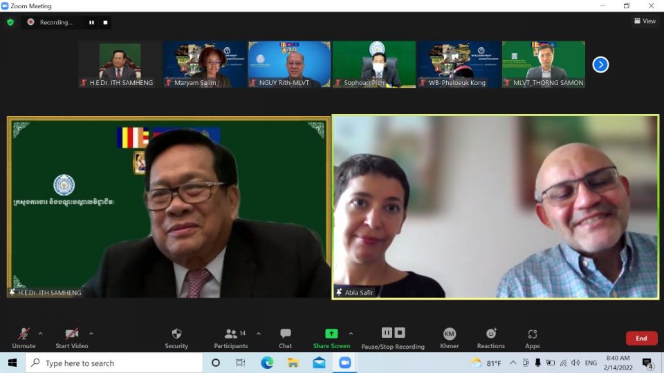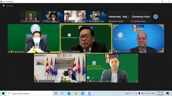 (ភ្នំពេញ)៖ រដ្ឋមន្ត្រីក្រសួងការងារ និងបណ្តុះបណ្តាលវិជ្ជាជីវៈ ឯកឧត្តមបណ្ឌិត អុិត សំហេង នាព្រឹកថ្ងៃទី១៤ ខែកុម្ភៈ ឆ្នាំ២០២២ បានជួបលោក Yasser El- Gammal នាយកគ្រប់គ្រងផ្នែកគាំពារសង្គម និងការអនុវត្តការងារជាសកលប្រចំាតំបន់អាស៊ីខាងកើត និងប៉ាស៊ីហ្វិក តាមរយៈប្រព័ន្ធវីដេអូអនឡាញ(Zoom) ដើម្បីជជែកពិភាក្សា កិច្ចការមួយចំនួនដែលធនាគារពិភពលោក (World Bank) អាចជួយគាំទ្រអ្វីខ្លះដល់ការអភិវឌ្ឍជំនាញ និងការចល័តកម្លាំងពលកម្មនៅកម្ពុជា ដើម្បីឱ្យឆ្លើយតបទៅនឹងតម្រូវការនិយោជក ឱ្យយុវជនទទួលបានការងារល្អៗ ដើម្បីបង្កើនចំណូលរបស់ពួកគេ និងដើម្បីចូលរួមបង្កើនផលិតភាពរបស់ប្រទេសកម្ពុជា។