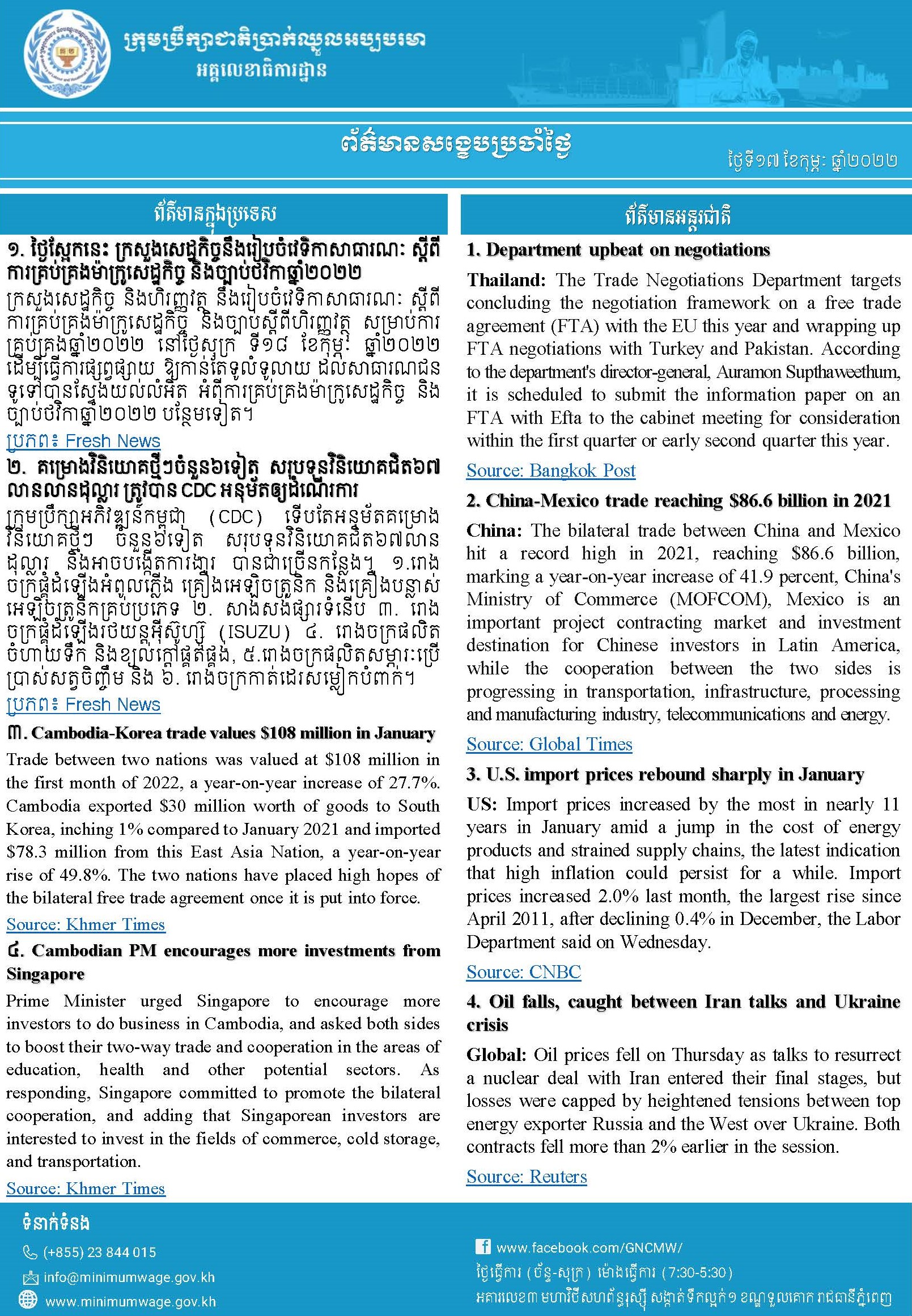 ព័ត៌មានសង្ខេបជាតិ និងអន្តរជាតិប្រចាំថ្ងៃទី១៧ ខែកុម្ភៈ ឆ្នាំ២០២២ ពី អគ្គលេខាធិការដ្ឋានក្រុមប្រឹក្សាជាតិប្រាក់ឈ្នួលអប្បបរមា