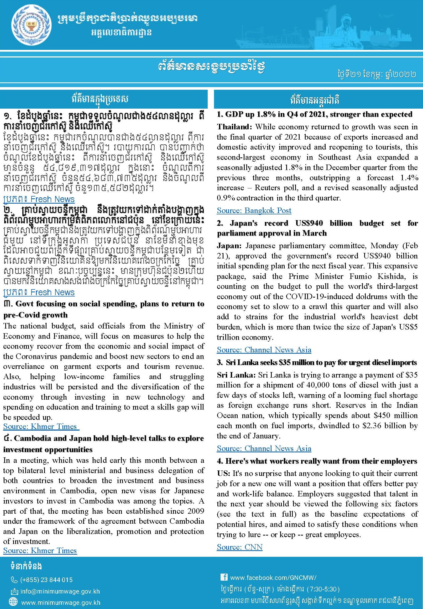 ព័ត៌មានសង្ខេបជាតិ និងអន្តរជាតិប្រចាំថ្ងៃទី២១ ខែកុម្ភៈ ឆ្នាំ២០២២ ពី អគ្គលេខាធិការដ្ឋានក្រុមប្រឹក្សាជាតិប្រាក់ឈ្នួលអប្បបរមា