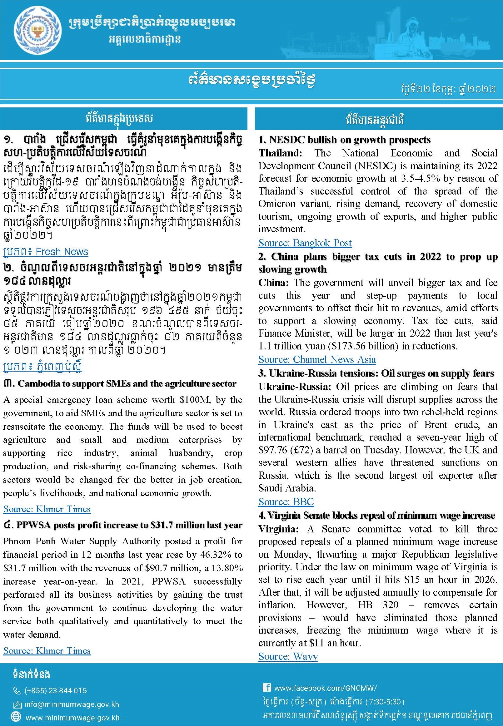 ព័ត៌មានសង្ខេបជាតិ និងអន្តរជាតិប្រចាំថ្ងៃទី២២ ខែកុម្ភៈ ឆ្នាំ២០២២ ពី អគ្គលេខាធិការដ្ឋានក្រុមប្រឹក្សាជាតិប្រាក់ឈ្នួលអប្បបរមា