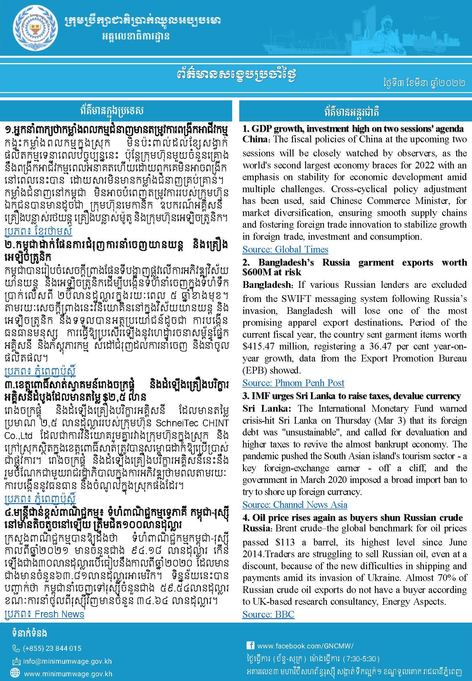 ព័ត៌មានសង្ខេបជាតិ និងអន្តរជាតិប្រចាំថ្ងៃទី៣ ខែមីនា ឆ្នាំ២០២២ ពី អគ្គលេខាធិការដ្ឋានក្រុមប្រឹក្សាជាតិប្រាក់ឈ្នួលអប្បបរមា
