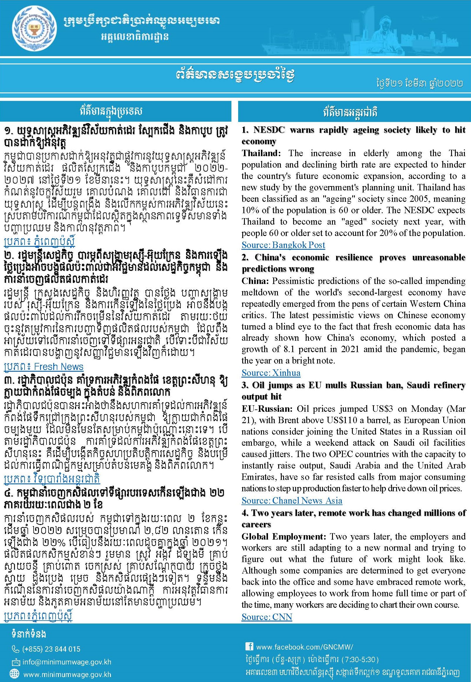 ២. រដ្ឋមន្រ្តីសេដ្ឋកិច្ច បារម្ភពីសង្រ្គាមរុស្ស៊ី-អ៊ុយក្រែន និងការឡើងថ្លៃប្រេងអាចបង្កផលប៉ះពាល់ជាអវិជ្ជមានដល់សេដ្ឋកិច្ចកម្ពុជា និងការនាំចេញផលិតផលកាត់ដេរ