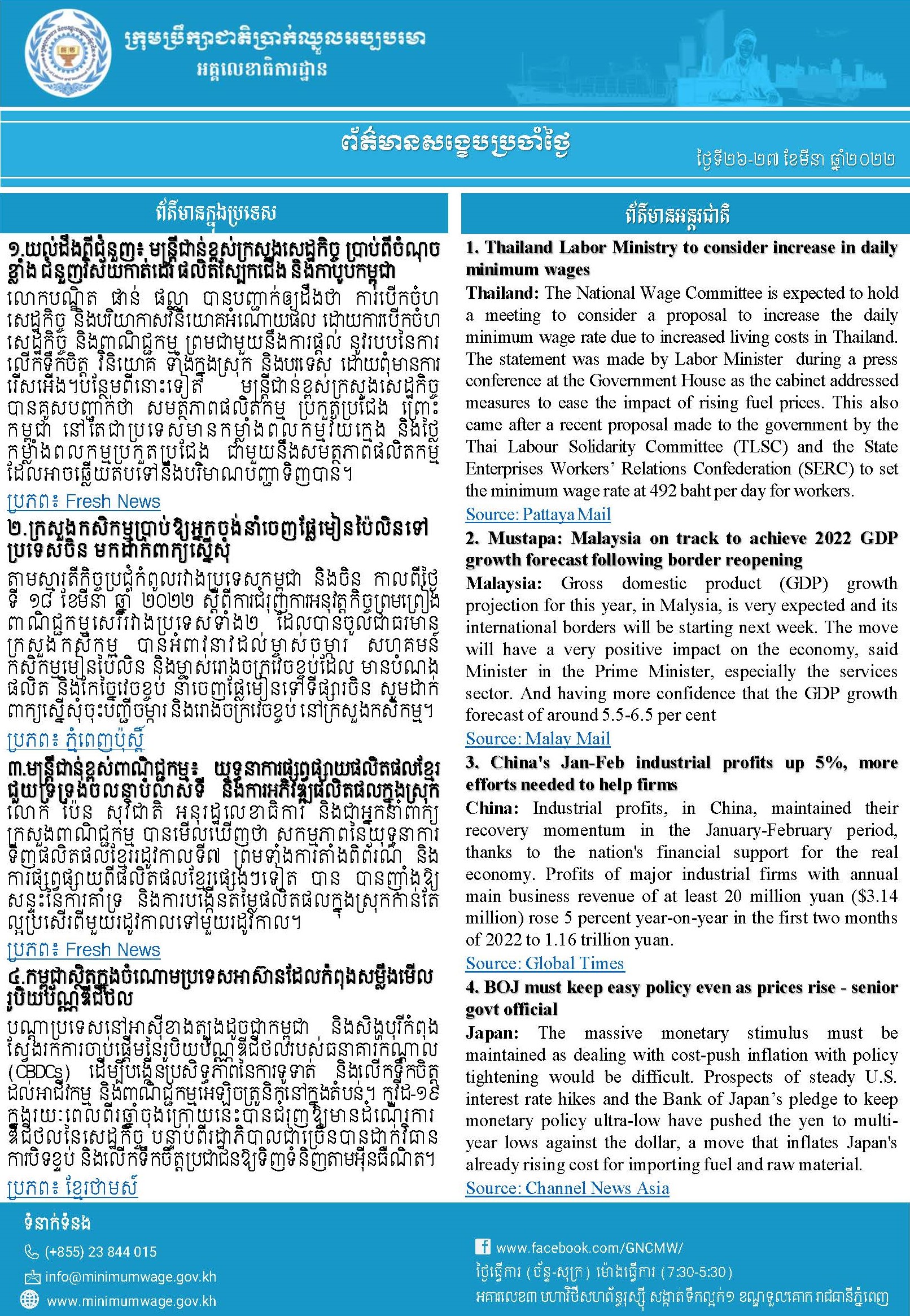 1. Thailand Labor Ministry to consider increase in daily minimum wages