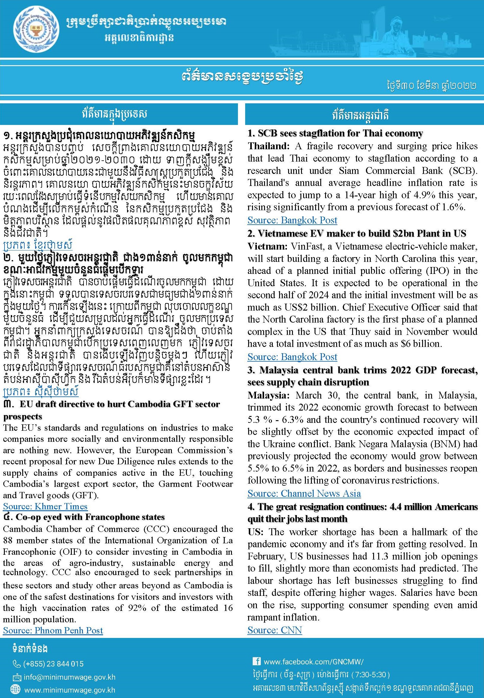 ព័ត៌មានសង្ខេបជាតិ និងអន្តរជាតិប្រចាំថ្ងៃទី៣០ ខែមីនា ឆ្នាំ២០២២ ពី អគ្គលេខាធិការដ្ឋានក្រុមប្រឹក្សាជាតិប្រាក់ឈ្នួលអប្បបរមា