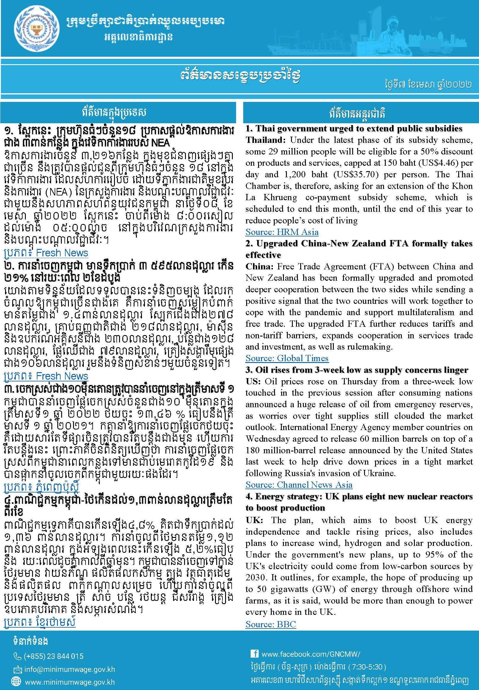 ព័ត៌មានសង្ខេបជាតិ និងអន្តរជាតិប្រចាំថ្ងៃទី០៧ ខែមេសា ឆ្នាំ២០២២ ពី អគ្គលេខាធិការដ្ឋានក្រុមប្រឹក្សាជាតិប្រាក់ឈ្នួលអប្បបរមា
