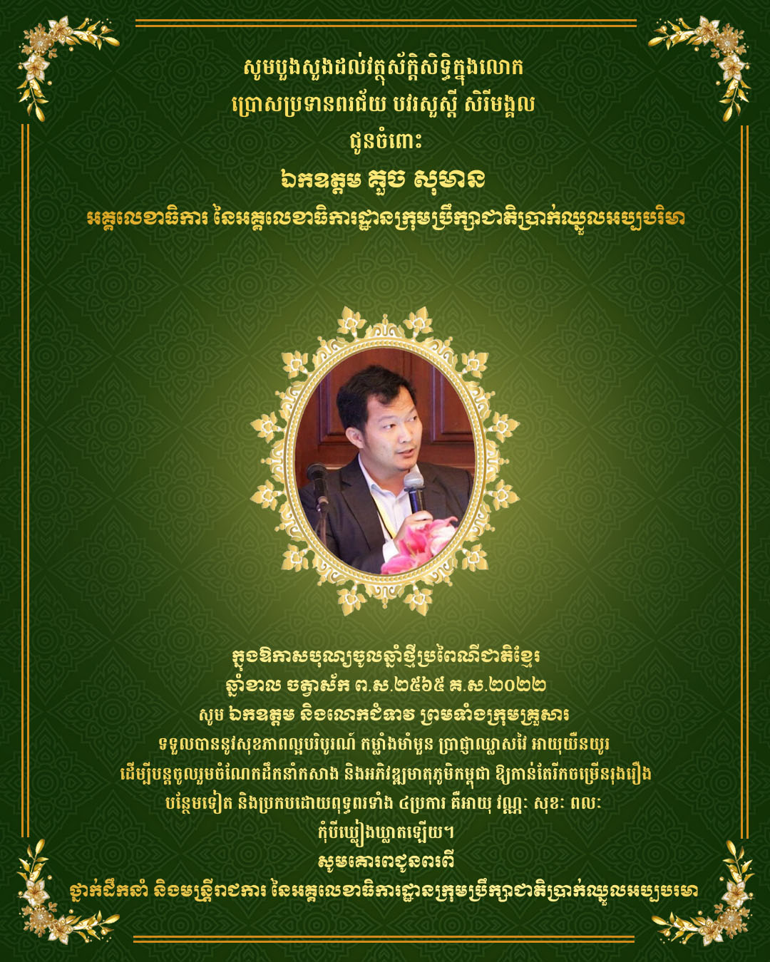 ក្នុងឱកាសពិធីបុណ្យចូលឆ្នាំថ្មីប្រពៃណីជាតិខ្មែរ ឆ្នាំខាល ចត្វាស័ក ព.ស.២៥៦៥ គ.ស.២០២២ ថ្នាក់ដឹកនាំ និងមន្រ្តីរាជការទាំងអស់ នៃអគ្គលេខាធិការដ្ឋានក្រុមប្រឹក្សាជាតិប្រាក់ឈ្នួលអប្បបរមា សូមបួងសួងដល់គុណបុណ្យព្រះរតនត្រ័យកែវទាំងបី វត្ថុស័ក្ដិសិទ្ធិក្នុងលោក និងទេវតាឆ្នាំថ្មីព្រះនាមកិរិណីទេវី សូមប្រោះព្រំប្រសិទ្ធពរជ័យ សិរីមង្គល វិបុលសុខ បវរមហារប្រសើរ និងជួយតាមថែរក្សាបីបាច់ដល់ ឯកឧត្តម និងលោកជំទាវ ព្រមទាំងក្រុមគ្រួសារ ទទួលបាននូវសុខភាពល្អបរិបូរណ៍ កម្លាំងមាំមួន ប្រាជ្ញាឈ្លាសវៃ អាយុយឺនយូរ ដើម្បីបន្តចូលរួមចំណែកដឹកនាំកសាង និងអភិវឌ្ឍមាតុភូមិកម្ពុជា ឱ្យកាន់តែរីកចម្រើនរុងរឿងបន្ថែមទៀត។