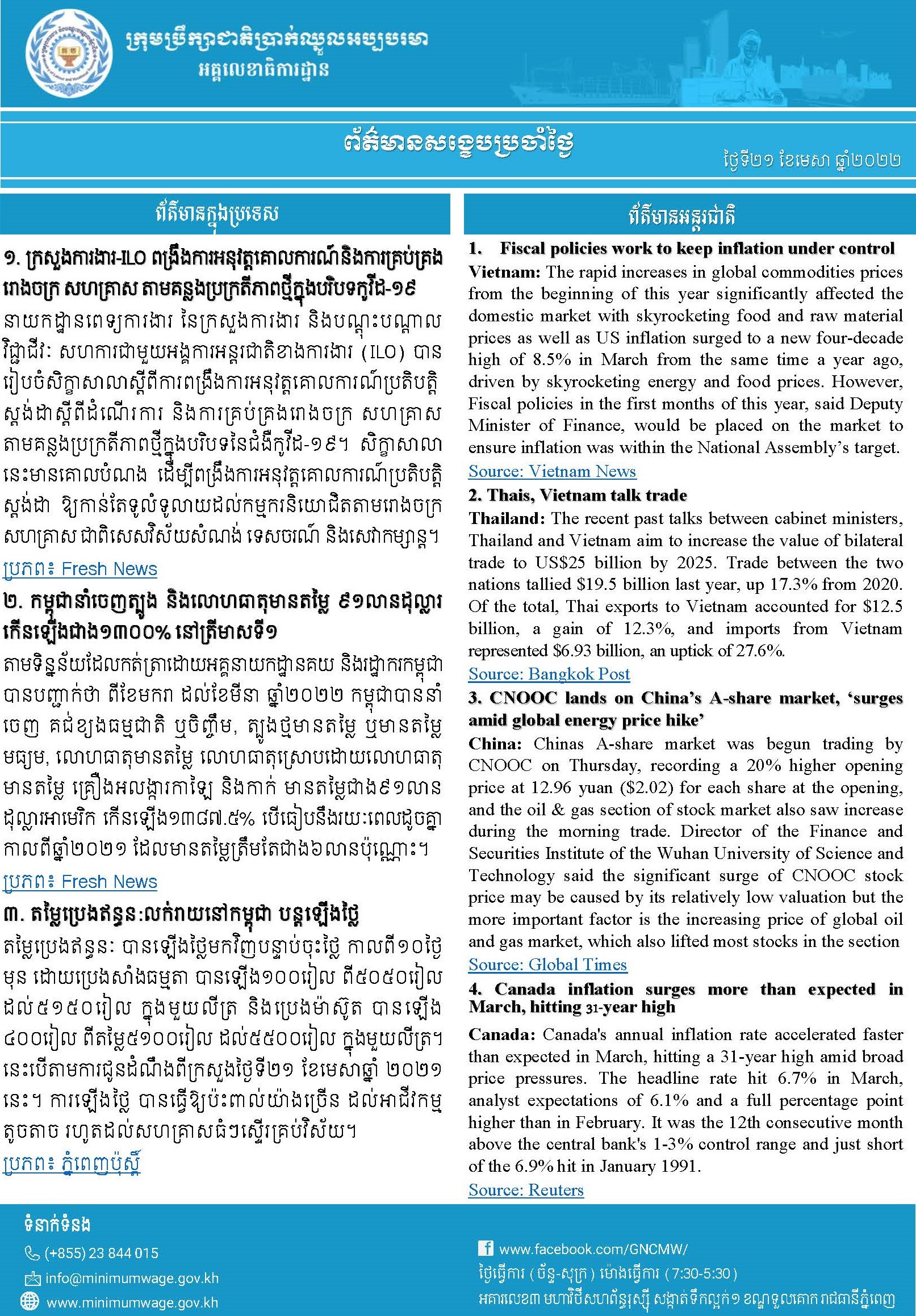 ១. ក្រសួងការងារ-ILO ពង្រឹងការអនុវត្តគោលការណ៍និងការគ្រប់គ្រងរោងចក្រ សហគ្រាស តាមគន្លងប្រក្រតីភាពថ្មីក្នុងបរិបទកូវីដ-១៩