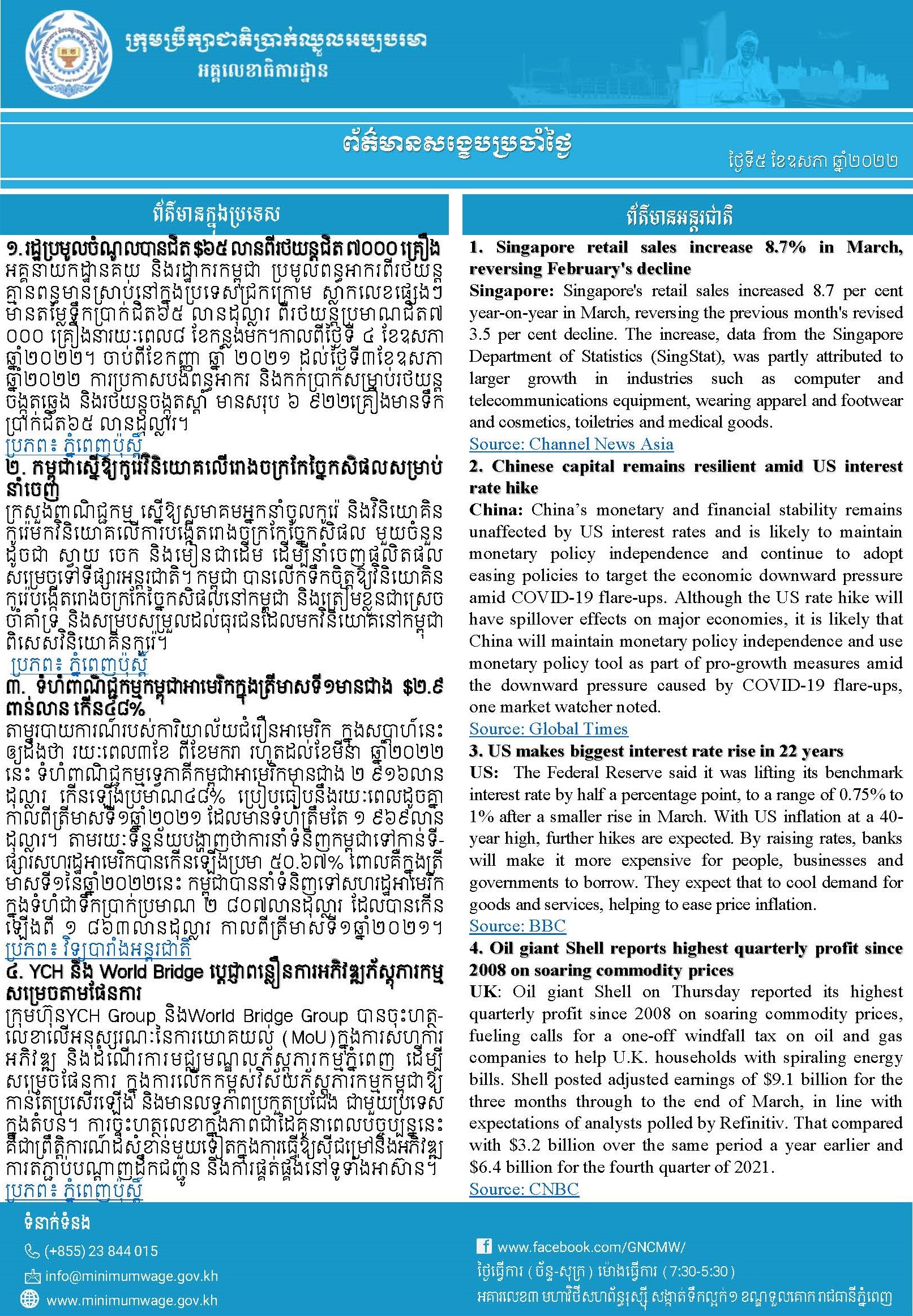 ព័ត៌មានសង្ខេបជាតិ និងអន្តរជាតិប្រចាំថ្ងៃទី៥ ខែឧសភា ឆ្នាំ២០២២ ពី អគ្គលេខាធិការដ្ឋានក្រុមប្រឹក្សាជាតិប្រាក់ឈ្នួលអប្បបរមា