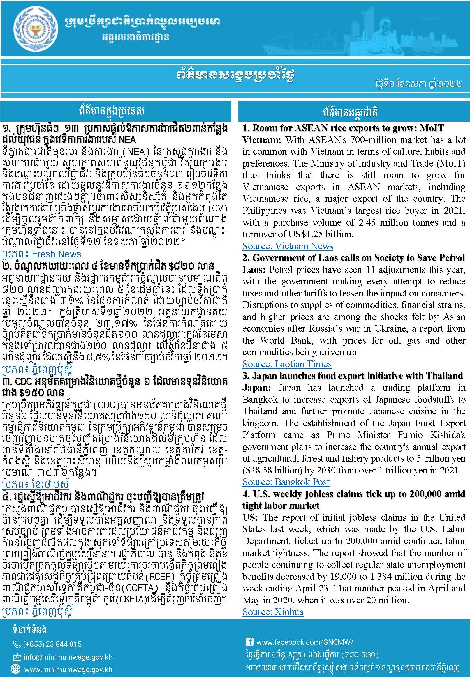 ៣. CDC អនុម័តគម្រោងវិនិយោគថ្មីចំនួន ៦ ដែលមានទុនវិនិយោគជាង $១៥០ លាន