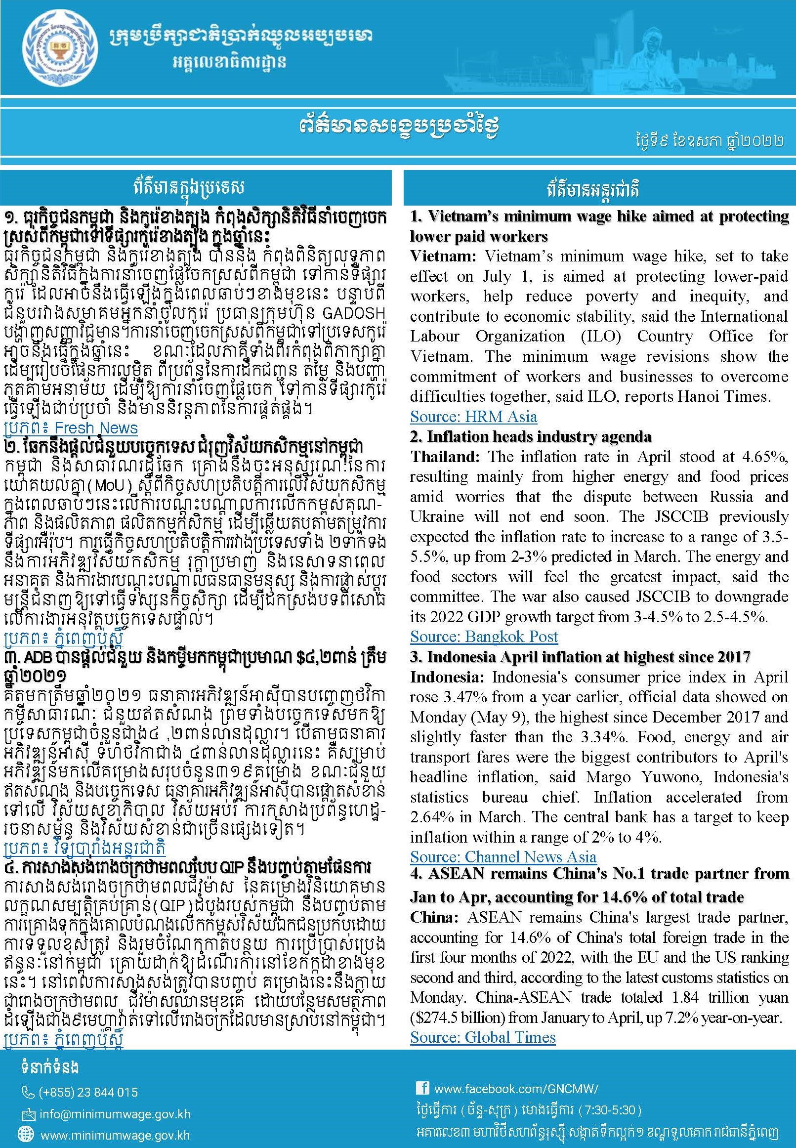 ព័ត៌មានសង្ខេបជាតិ និងអន្តរជាតិប្រចាំថ្ងៃទី៩ ខែឧសភា ឆ្នាំ២០២២ ពី អគ្គលេខាធិការដ្ឋានក្រុមប្រឹក្សាជាតិប្រាក់ឈ្នួលអប្បបរមា