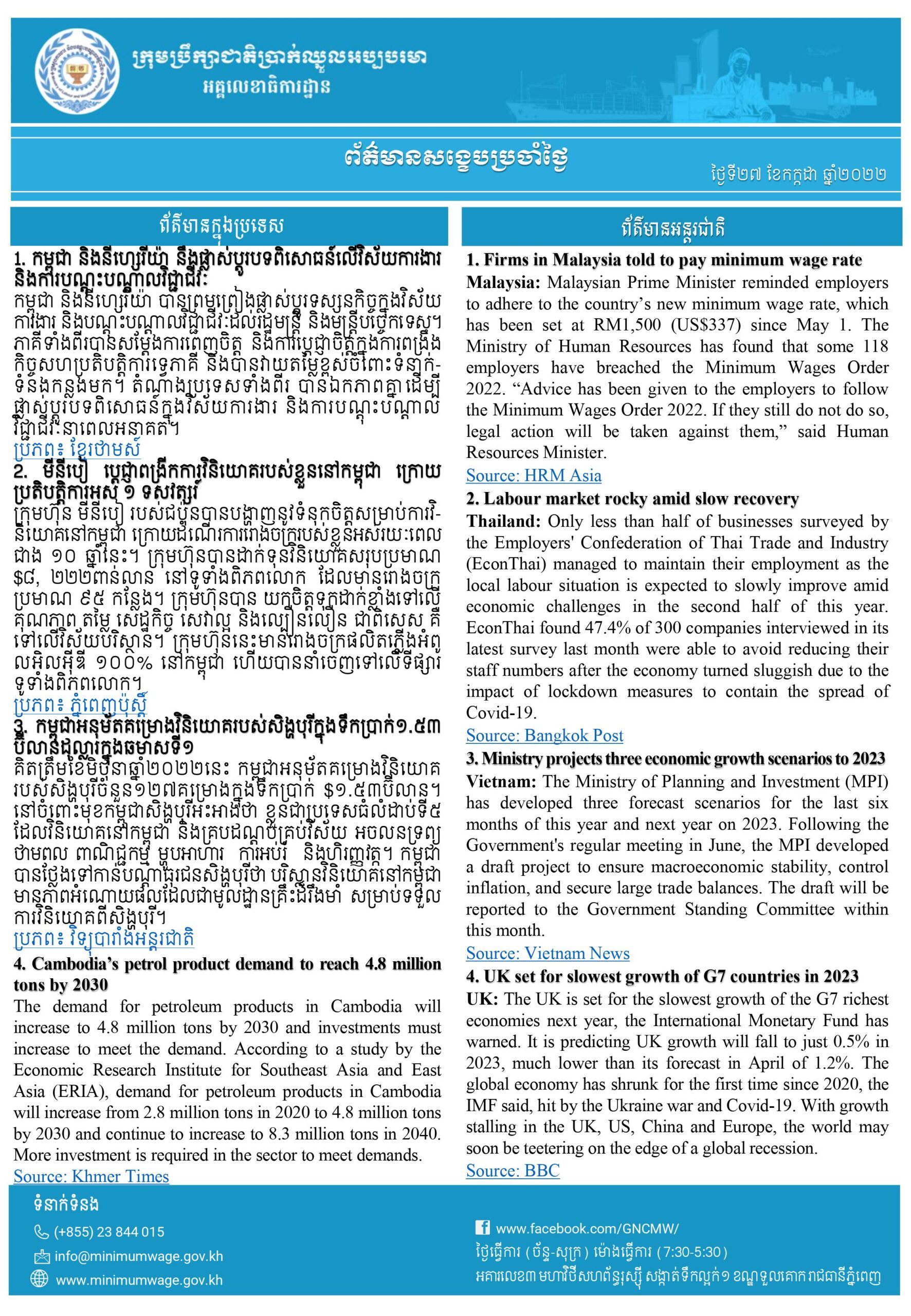 ព័ត៌មានសង្ខេបជាតិ និងអន្តរជាតិប្រចាំថ្ងៃទី១ ខែកុម្ភៈ ឆ្នាំ២០២២ ពី អគ្គលេខាធិការដ្ឋានក្រុមប្រឹក្សាជាតិប្រាក់ឈ្នួលអប្បបរមា
