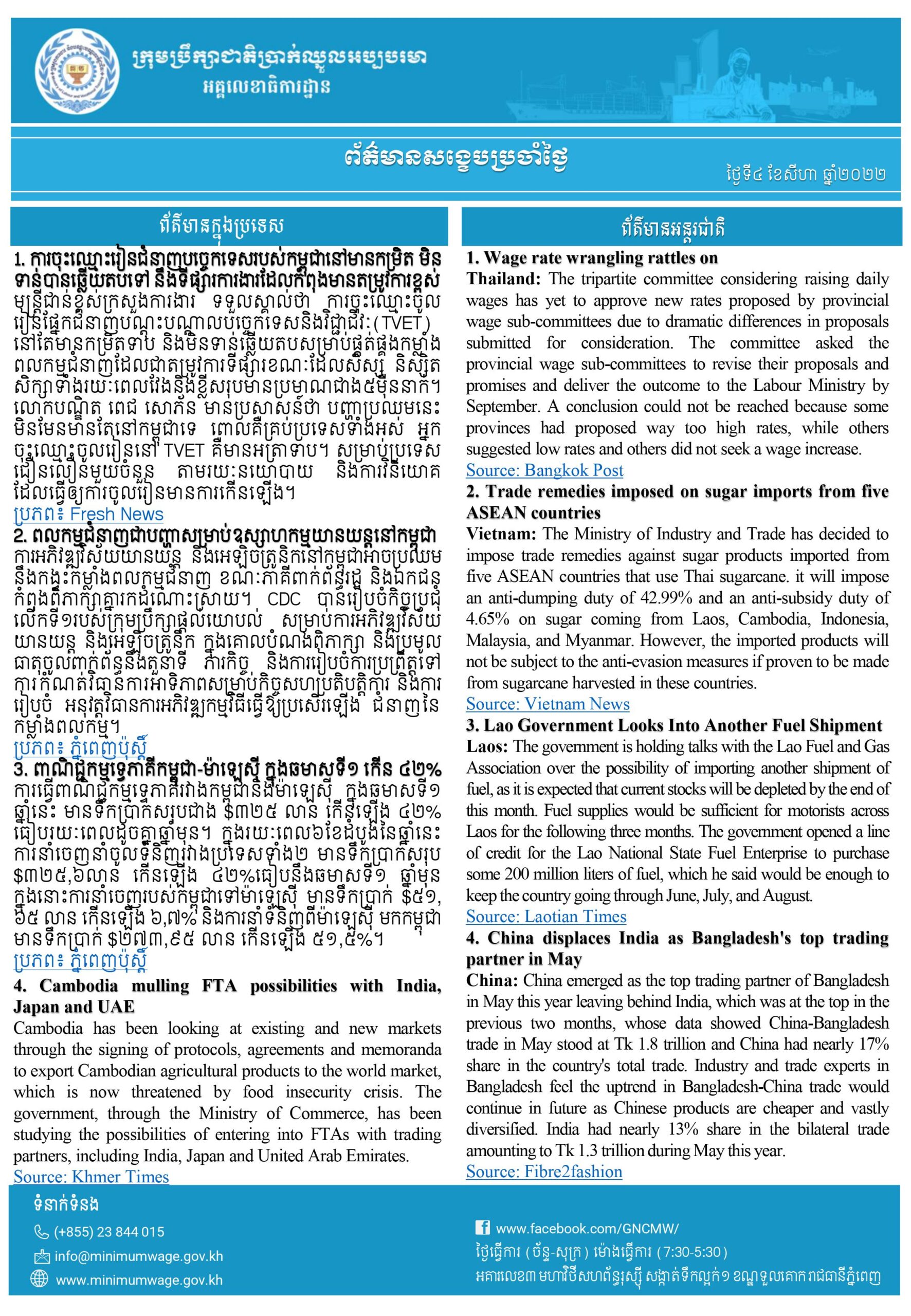 ព័ត៌មានសង្ខេបជាតិ និងអន្តរជាតិប្រចាំថ្ងៃទី៨ ខែកក្កដា ឆ្នាំ២០២២ ពី អគ្គលេខាធិការដ្ឋានក្រុមប្រឹក្សាជាតិប្រាក់ឈ្នួលអប្បបរមា