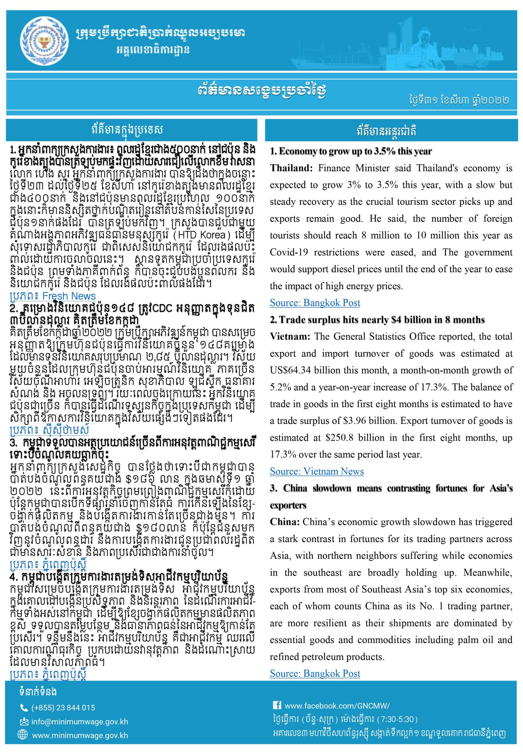 ១. អ្នកនាំពាក្យក្រសួងការងារ៖ ពលរដ្ឋខ្មែរជាង៥០០នាក់ នៅជប៉ុន និងកូរ៉េខាងត្បូងបានត្រឡប់មកផ្ទះវិញដោយសារជឿលើលោកខឹម វាសនា