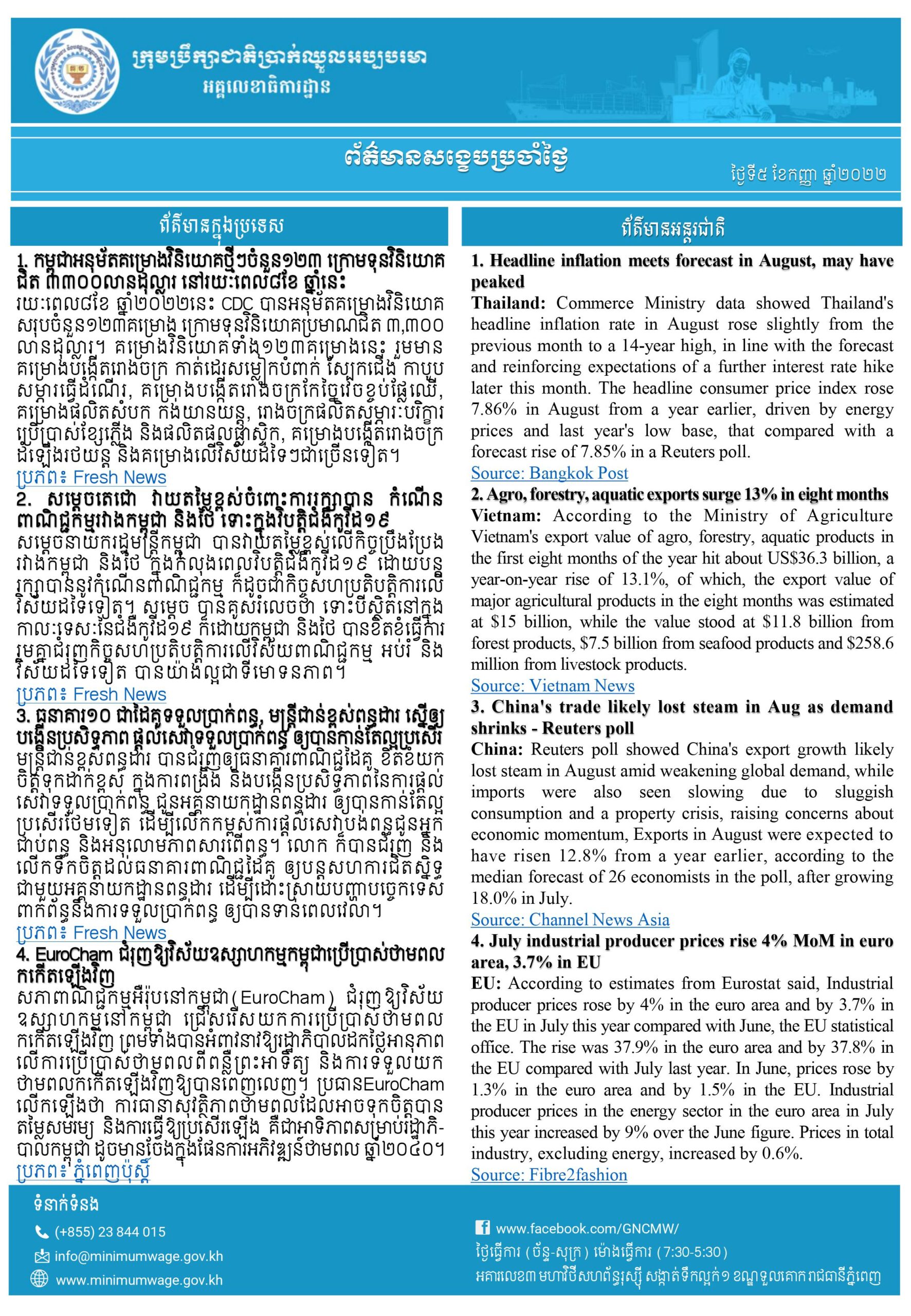 ១. កម្ពុជាអនុម័តគម្រោងវិនិយោគថ្មីៗចំនួន១២៣ ក្រោមទុនវិនិយោគជិត ៣៣០០លានដុល្លារ នៅរយៈពេល៨ខែ ឆ្នាំនេះ