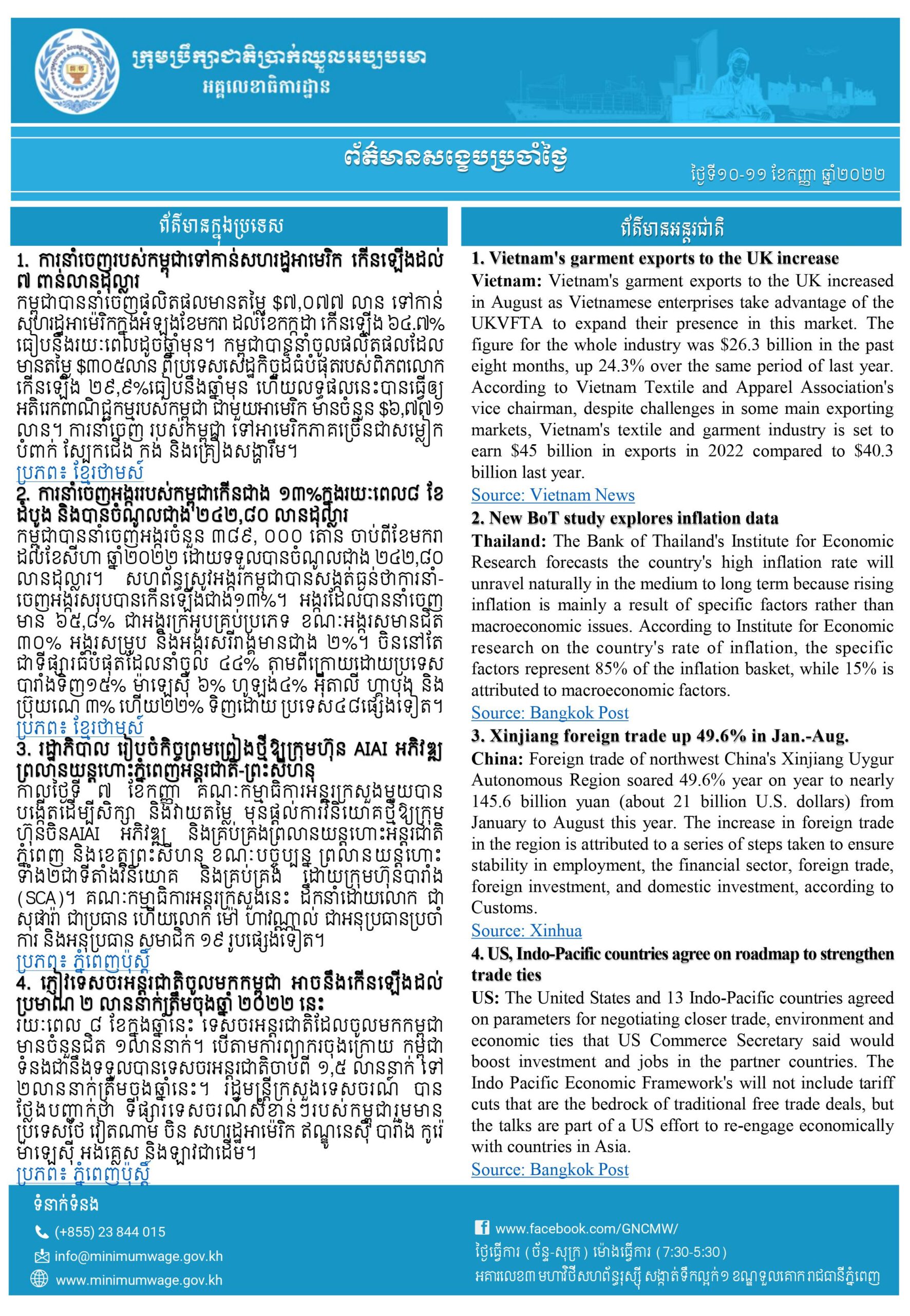 ១. ការនាំចេញរបស់កម្ពុជាទៅកាន់សហរដ្ឋអាមេរិក កើនឡើងដល់ ៧ ពាន់លានដុល្លារ