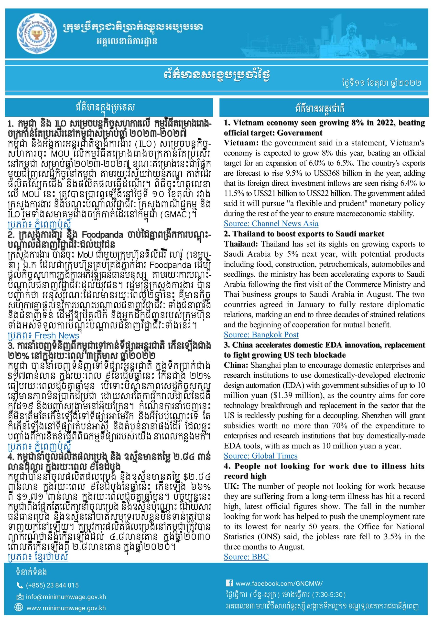 ព័ត៌មានសង្ខេបជាតិ និងអន្តរជាតិប្រចាំថ្ងៃទី៣០ ខែឧសភា ឆ្នាំ២០២២ ពី អគ្គលេខាធិការដ្ឋានក្រុមប្រឹក្សាជាតិប្រាក់ឈ្នួលអប្បបរមា
