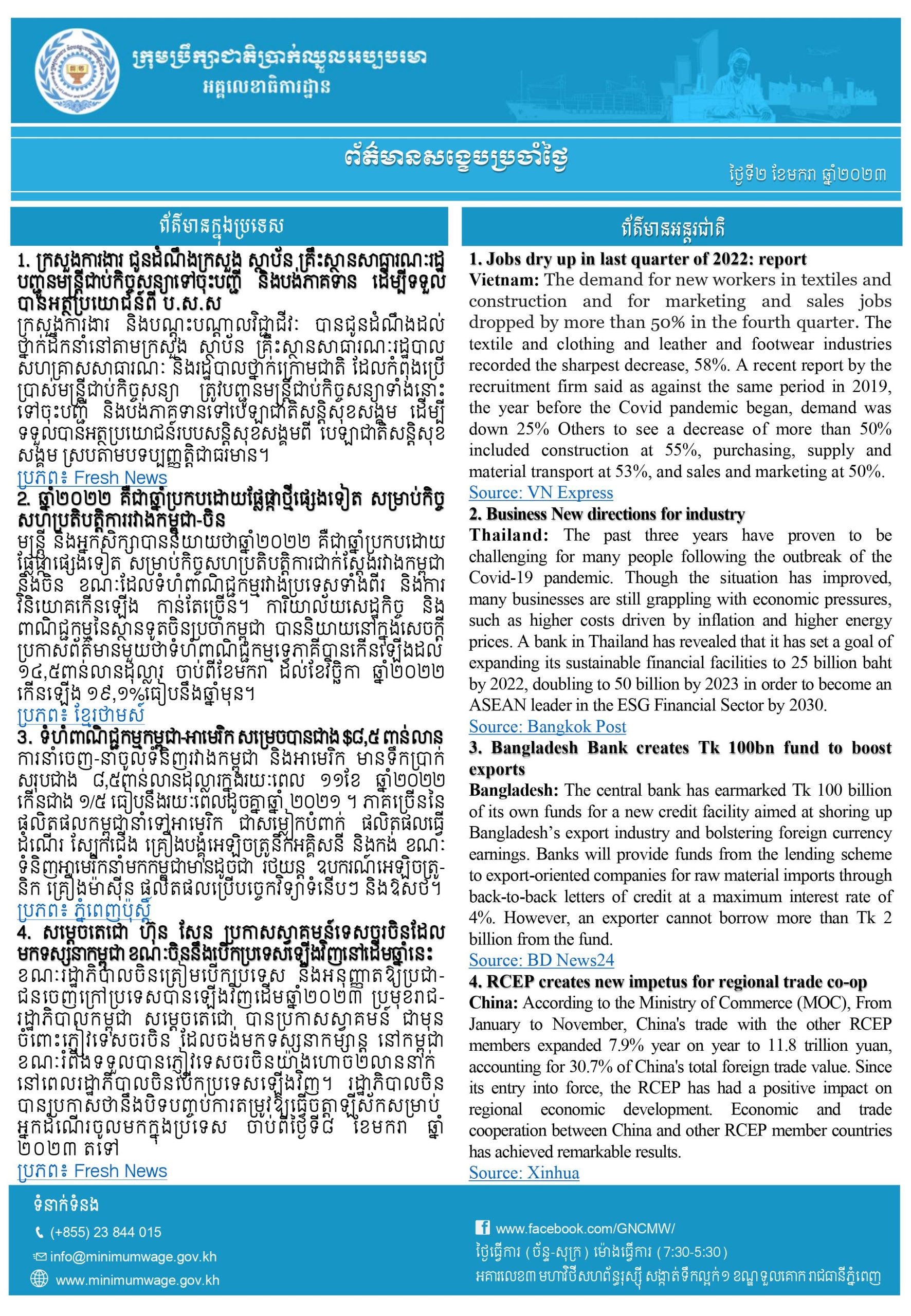 ព័ត៌មានសង្ខេបជាតិ និងអន្តរជាតិប្រចាំថ្ងៃទី០៧ ខែមេសា ឆ្នាំ២០២២ ពី អគ្គលេខាធិការដ្ឋានក្រុមប្រឹក្សាជាតិប្រាក់ឈ្នួលអប្បបរមា