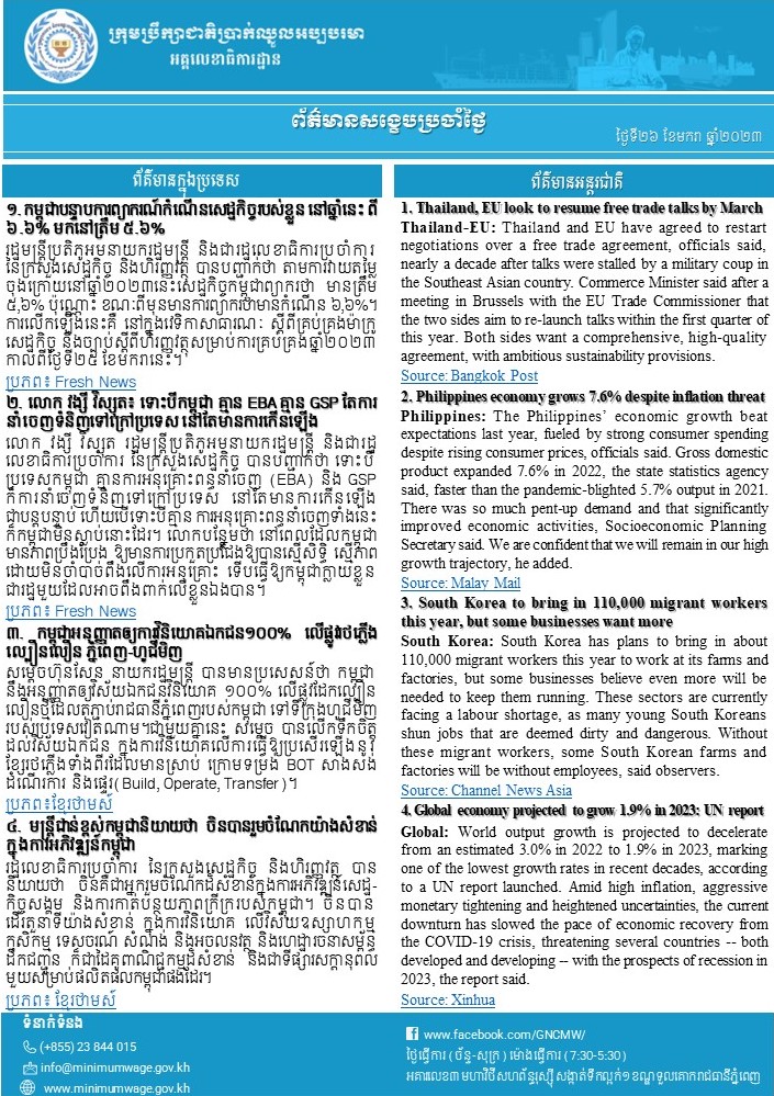 ១. កម្ពុជាបន្ទាបការព្យាករណ៍កំណើនសេដ្ឋកិច្ចរបស់ខ្លួន នៅឆ្នាំនេះ ពី ៦.៦% មកនៅត្រឹម ៥.៦%