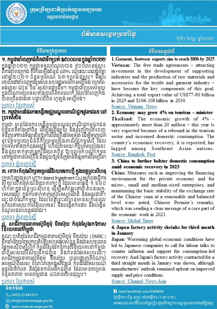 ៣. HTTH កំពុងសិក្សាគម្រោងវិនិយោគកោះថ្មី ក្នុងខេត្តព្រះសីហនុ៤. សាជីវកម្មធនាគារស៊ូមីតូម៉ុ មីតស៊ុយ កំពុងស្វែងរកឱកាសវិនិយោគនៅកម្ពុជា