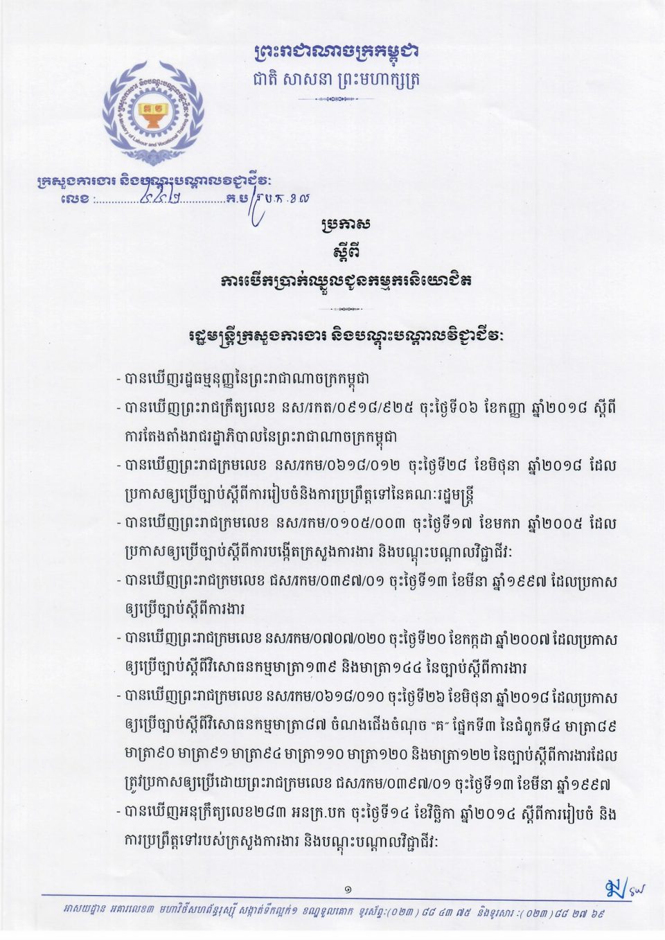 ប្រកាសប្រកាសស្ដីពីការបើកប្រាក់ឈ្នួលជូនកម្មករនិយោជិត Monday, 23 October, 20230508 ប្រកាសស្ដីពីការបើកប្រាក់ឈ្នួលជូនកម្មករនិយោជិត