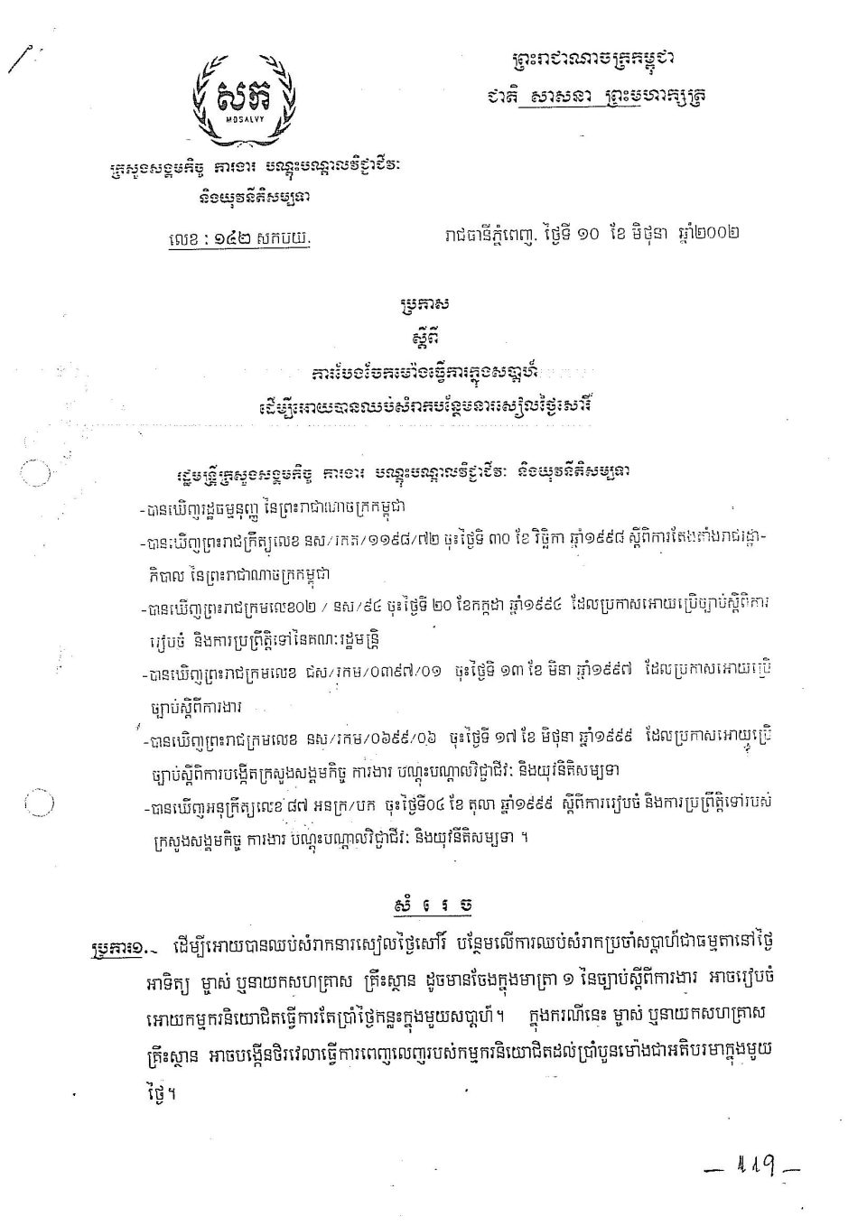 ប្រកាសស្ដីពីការបែងចែកម៉ោងធ្វើការក្នុងសប្ដាហ៍ដើម្បីអោយបានឈប់សំរាកបន្ថែមនារសៀលថ្ងៃសៅរ៍