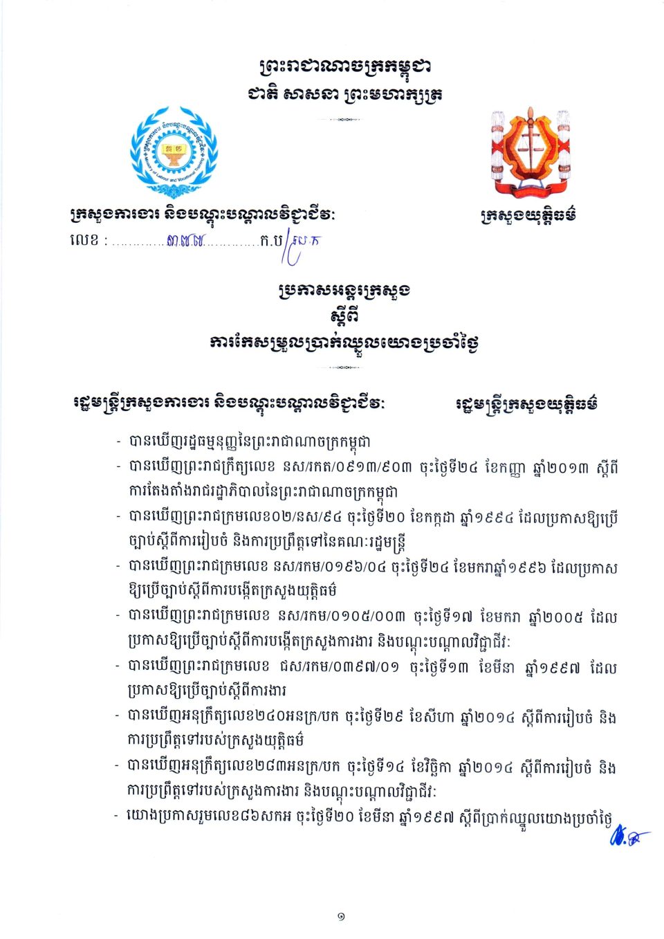 ប្រកាសប្រកាសអន្តរក្រសួងស្ដីពីការកែសម្រួលយោងប្រាក់ឈ្នួលប្រចាំថ្ងៃ Monday, 23 October, 20230527 ប្រកាសអន្តរក្រសួងស្ដីពីការកែសម្រួលយោងប្រាក់ឈ្នួលប្រចាំថ្ងៃ