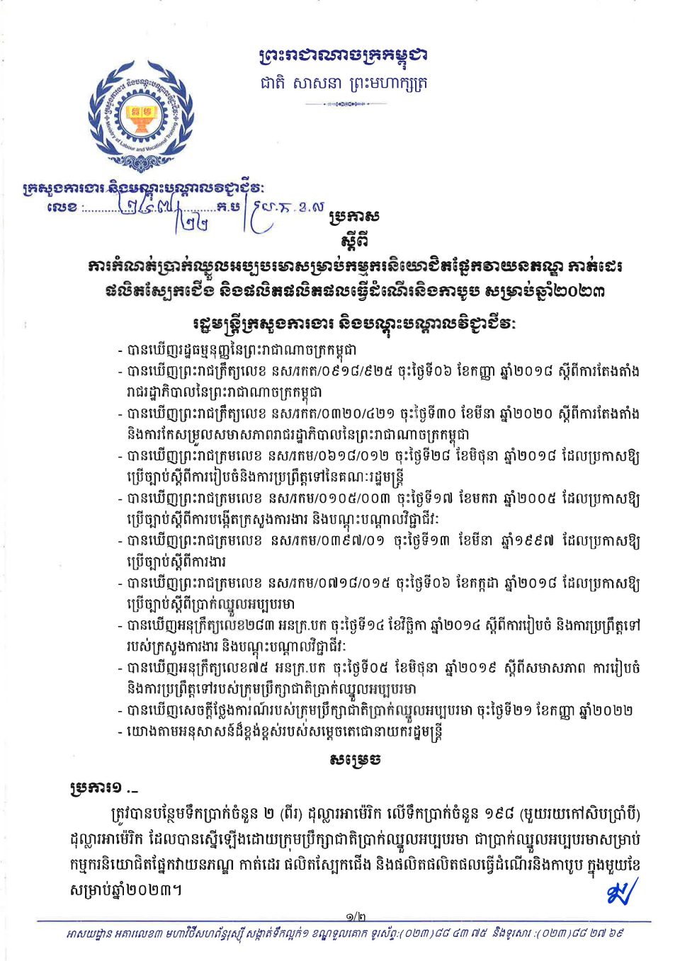 ប្រកាសប្រកាសស្ដីពីការកំណត់ប្រាក់ឈ្នួលអប្បបរមាសម្រាប់កម្មករនិយោជិតវិស័យវាយនភណ្ឌកាត់ដេរសំលៀកបំពាក់និងផលិតស្បែកជើងសម្រាប់ឆ្នាំ២០២៣ Monday, 23 October, 20230518 ប្រកាសស្ដីពីការកំណត់ប្រាក់ឈ្នួលអប្បបរមាសម្រាប់កម្មករនិយោជិតសម្រាប់ឆ្នាំ២០២៣