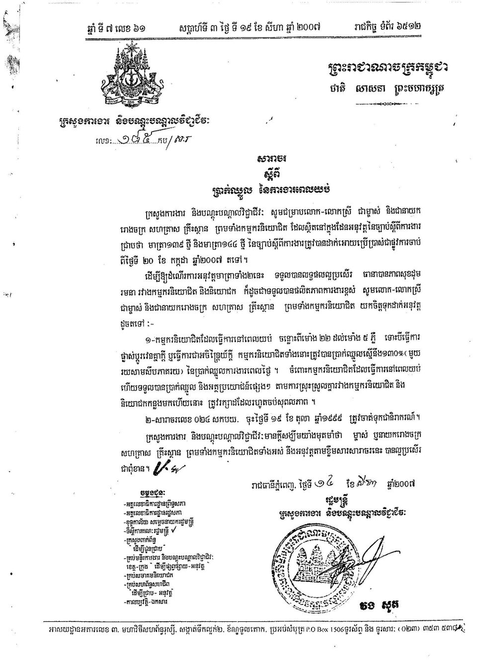 សេចក្តីជូនដំណឹងសារាចរស្ដីពីប្រាក់ឈ្នួល នៃការងារពេលយប់ Friday, 27 October, 20230545 សារាចរស្ដីពីការងារពេលយប់