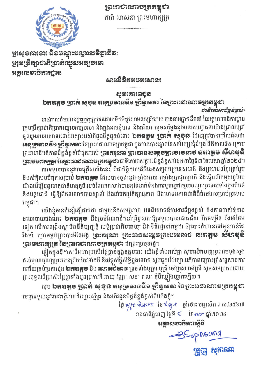 សារលិខិតអបអរសាទរ និងគោរពជូនពរ ឯកឧត្តម ប្រាក់ សុខុន ក្នុងឱកាសដែល ឯកឧត្តម ត្រូវបានព្រឹទ្ធសភាបោះឆ្នោតជ្រើសរើសជា “អនុប្រធានទី១​ ព្រឹទ្ធសភា”
