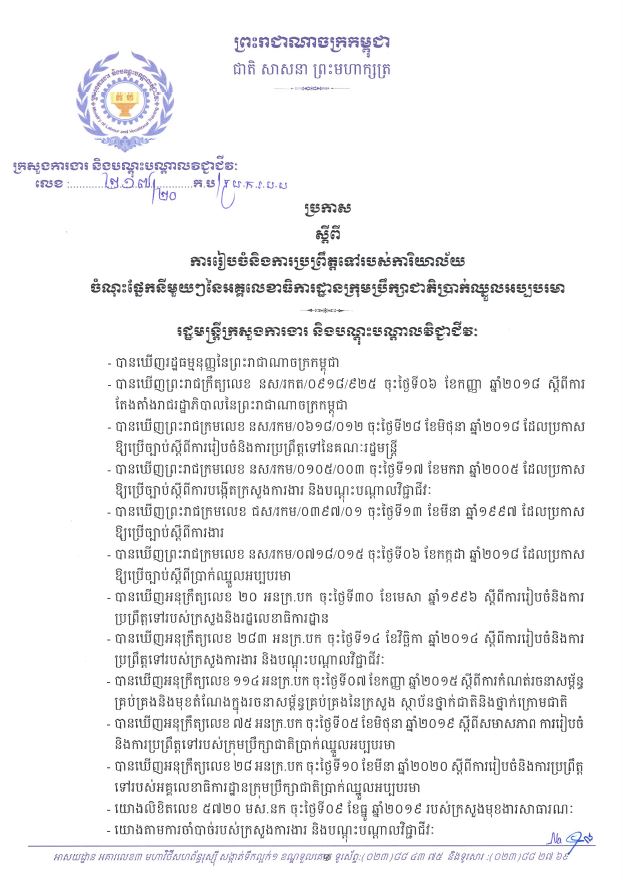 ប្រកាសប្រកាស ស្តីពីការរៀបចំ និងការប្រព្រឹត្តទៅរបស់ការិយាល័យចំណុះផ្នែកនីមួយៗនៃអគ្គលេខាធិការដ្ឋានក្រុមប្រឹក្សាជាតិប្រាក់ឈ្នួលអប្បបរមា Sunday, 21 March, 2021Sunday, 21 March, 202101644 ប្រកាស ស្តីពីការរៀបចំ និងការប្រព្រឹត្តទៅរបស់ការិយាល័យចំណុះផ្នែកនីមួយៗនៃអគ្គលេខាធិការដ្ឋានក្រុមប្រឹក្សាជាតិប្រាក់ឈ្នួលអប្បបរមា