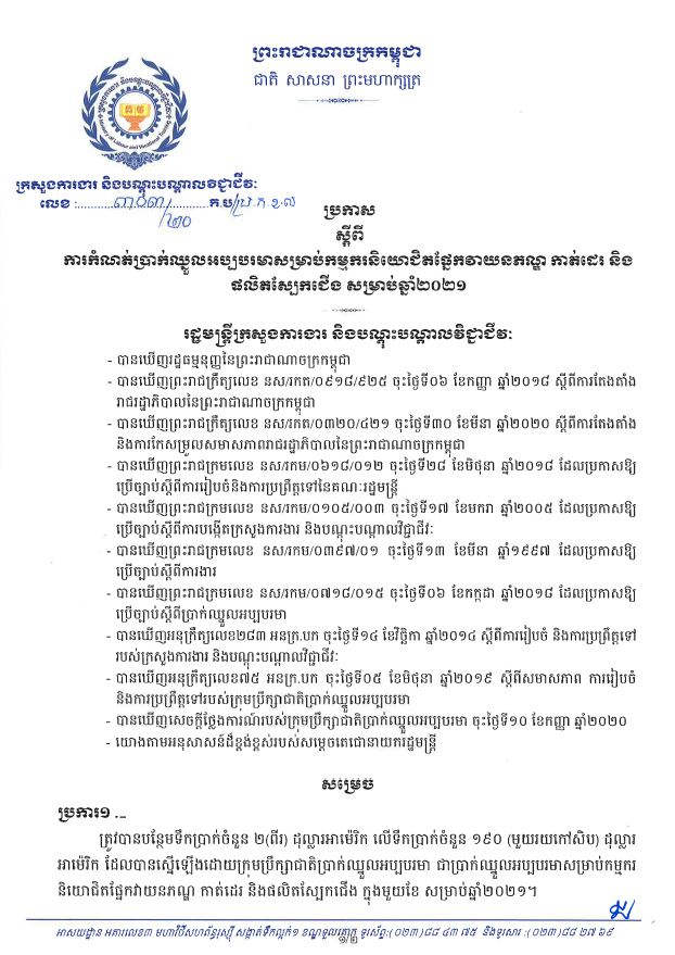ប្រកាសប្រកាស ស្ដីពីការកំណត់ប្រាក់ឈ្នួលអប្បបរមាសម្រាប់កម្មករនិយោជិតផ្នែកវាយភណ្ឌ កាត់ដេរ និងផលិតស្បែកជើង សម្រាប់ឆ្នាំ២០២១ Sunday, 21 March, 2021Sunday, 21 March, 202102461 ប្រកាស ស្ដីពីការកំណត់ប្រាក់ឈ្នួលអប្បបរមាសម្រាប់កម្មករនិយោជិតផ្នែកវាយភណ្ឌ កាត់ដេរ និងផលិតស្បែកជើង សម្រាប់ឆ្នាំ២០២១