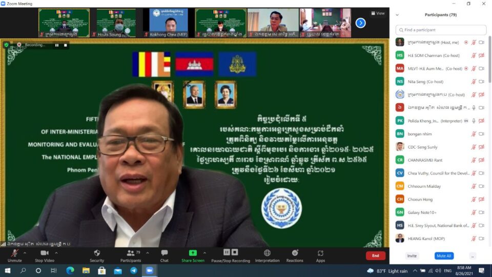 (ភ្នំពេញ)៖គណៈកម្មការអន្តរក្រសួងសម្រាប់ដឹកនាំ ត្រួតពិនិត្យ និងវាយតម្លៃលើការអនុវត្ត គោលនយោបាយជាតិស្ដីពីមុខរបរ និងការងារ ឆ្នាំ២០១៥-២០២៥ នាព្រឹកថ្ងៃទី២៦ ខែសីហា ឆ្នាំ២០២១នេះ បានបើកកិច្ចប្រជុំលើកទី៥របស់ខ្លួន តាមប្រព័ន្ធវីដេអូ (Zoom) ក្រោមអធិបតីភាពឯកឧត្តមបណ្ឌិត អុិត សំហេង រដ្ឋមន្ត្រីក្រសួងការងារ និងបណ្តុះបណ្តាលវិជ្ជាជីវៈ និងជាប្រធានគណៈកម្មការអន្តរក្រសួងសម្រាប់ដឹកនាំ ត្រួតពិនិត្យ និងវាយតម្លៃលើការអនុវត្តគោលនយោបាយជាតិស្តីពីមុខរបរ និងការងារ ឆ្នាំ២០១៥-២០២៥។